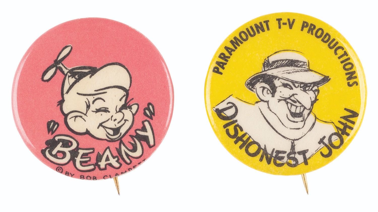 (Clampett, 1950s) A pair of “Time for Beany” pinback buttons featuring Beany and Dishonest John. Measuring 1.25” in diameter, the buttons display in fine condition.