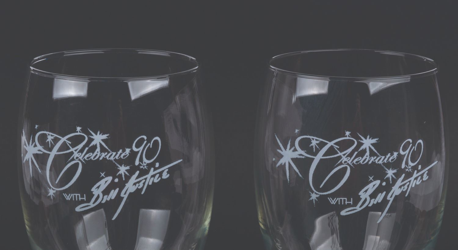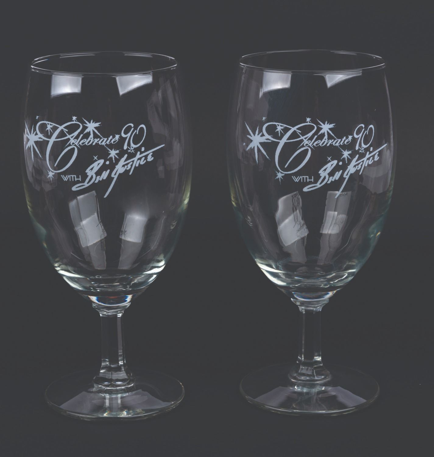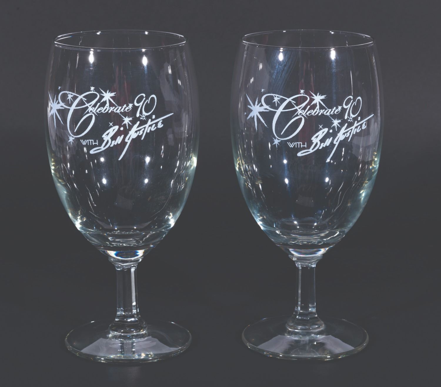 (Justice, 2004) A pair of Celebrate 90 with Bill Justice glasses from the Disney Legend’s 90th birthday party. Measuring 7” tall and 3” in diameter each, the glasses are in good condition with light scratches, smudges, and wear.