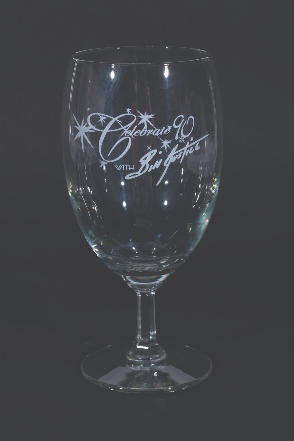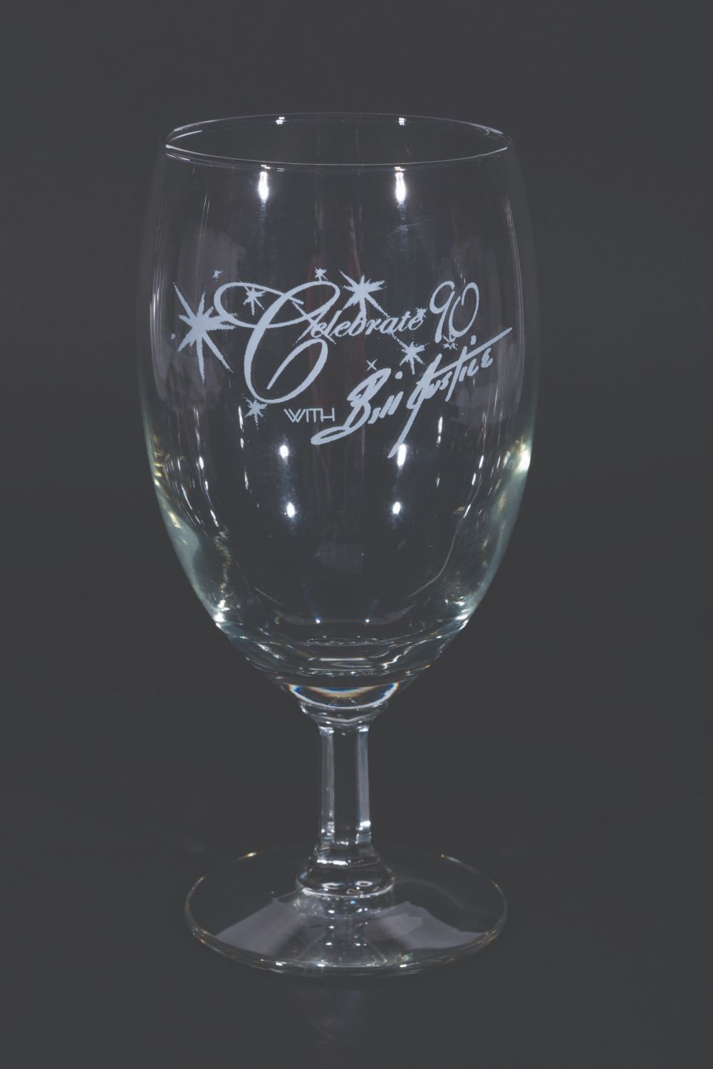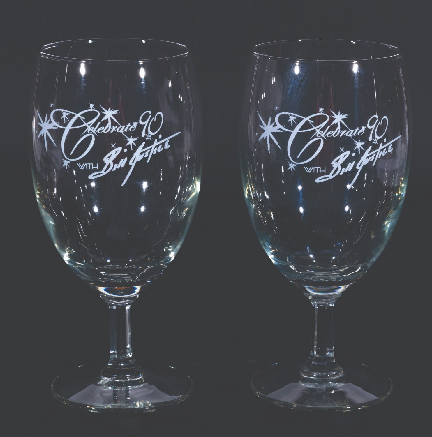 (Justice, 2004) A pair of Celebrate 90 with Bill Justice glasses from the Disney Legend’s 90th birthday party. Measuring 7” tall and 3” in diameter each, the glasses are in good condition with light scratches, smudges, and wear.
