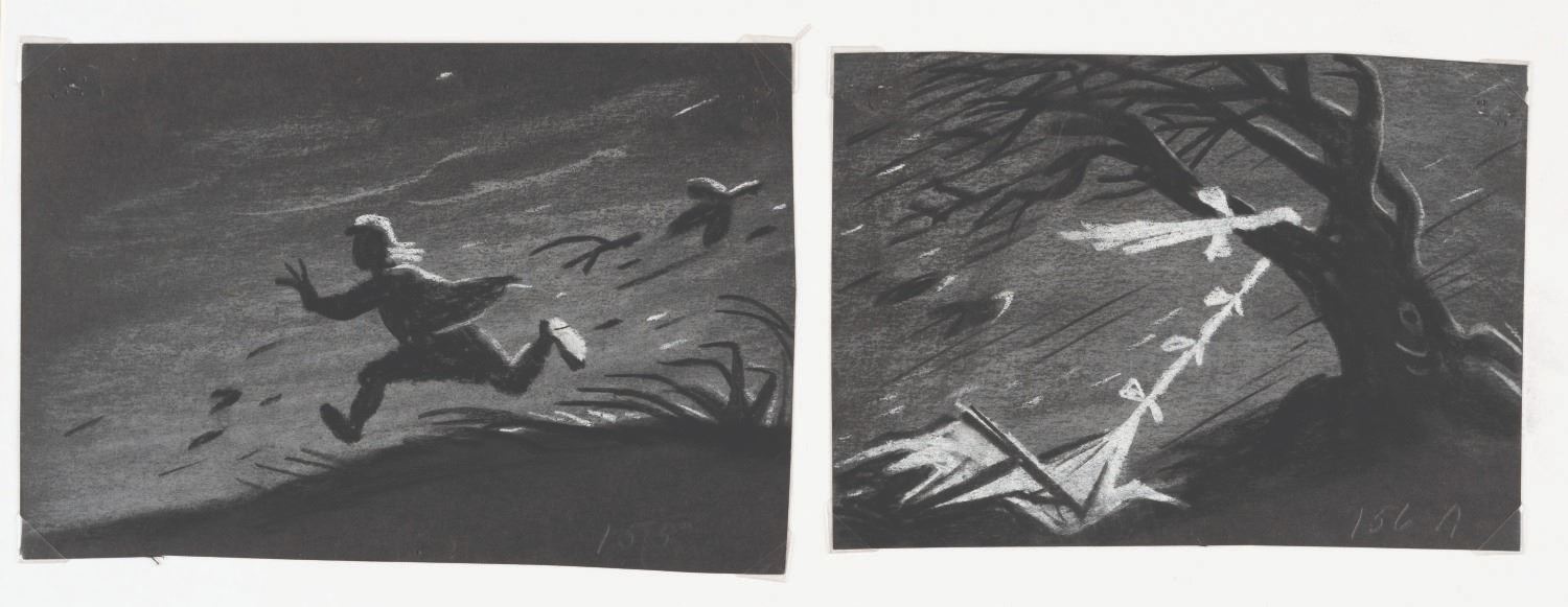 (Disney, 1953) A pair of original storyboard panels from Disney's 1953 featurette "Ben and Me" by Disney Legend Bill Peet.  Accomplished in mixed media, the panels measure 4.5” x 6.75” and 4.25” x 6”  and are in very good condition with pin holes from original production use.