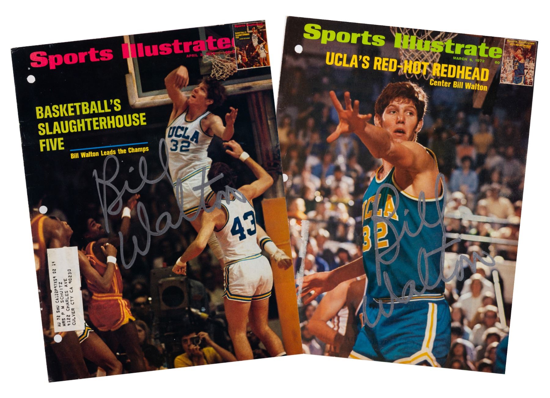 (Walton, 1972) A pair of 1972 Sports Illustrated covers signed by basketball's Bill Walton. In 1972, Walton played for UCLA before going on to a long career in the NBA. Each measuring 8.25" x 11", the boldly signed covers display in good condition with typical handling wear, a mailing label on one and residue from a label on the other, and both three-hole punched on the left edge.