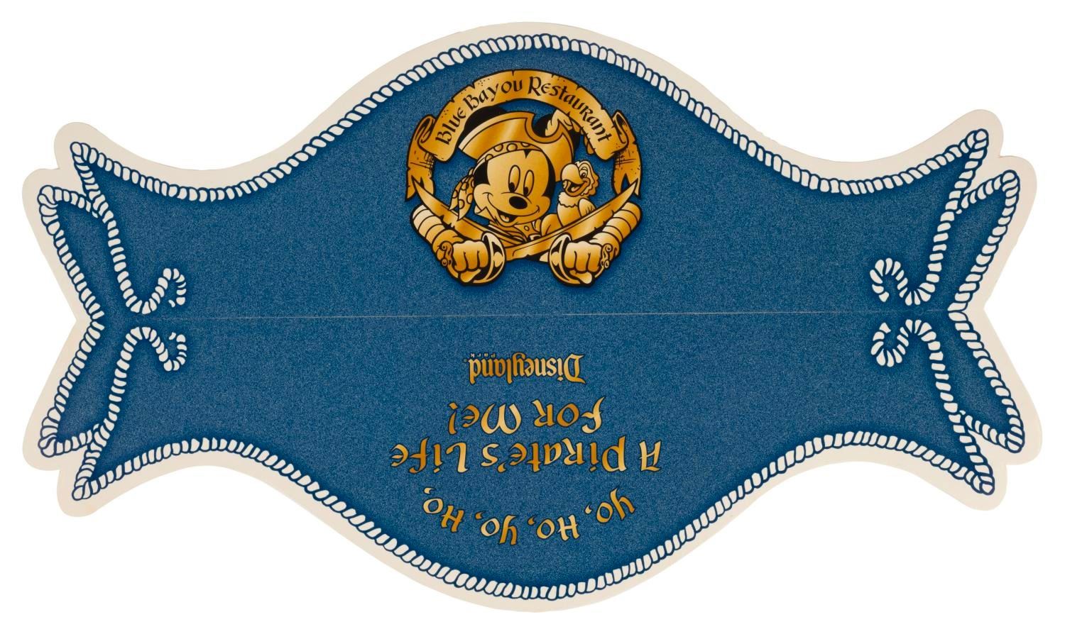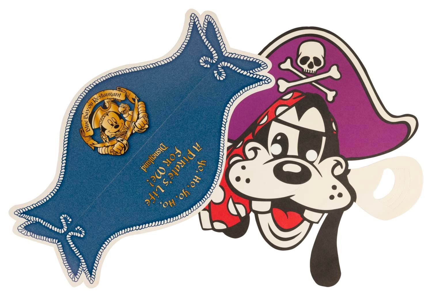 (Disneyland, 1980s-2005) A pair of children's menus from the atmospheric Blue Bayou Restaurant. One menu doubles as a Goofy pirate mask, while the other doubles as a pirate hat. Measuring 13.5"x12.5" and 15"x9" respectively, the menus are in very good condition with minor spotting on the reverse of Goofy.