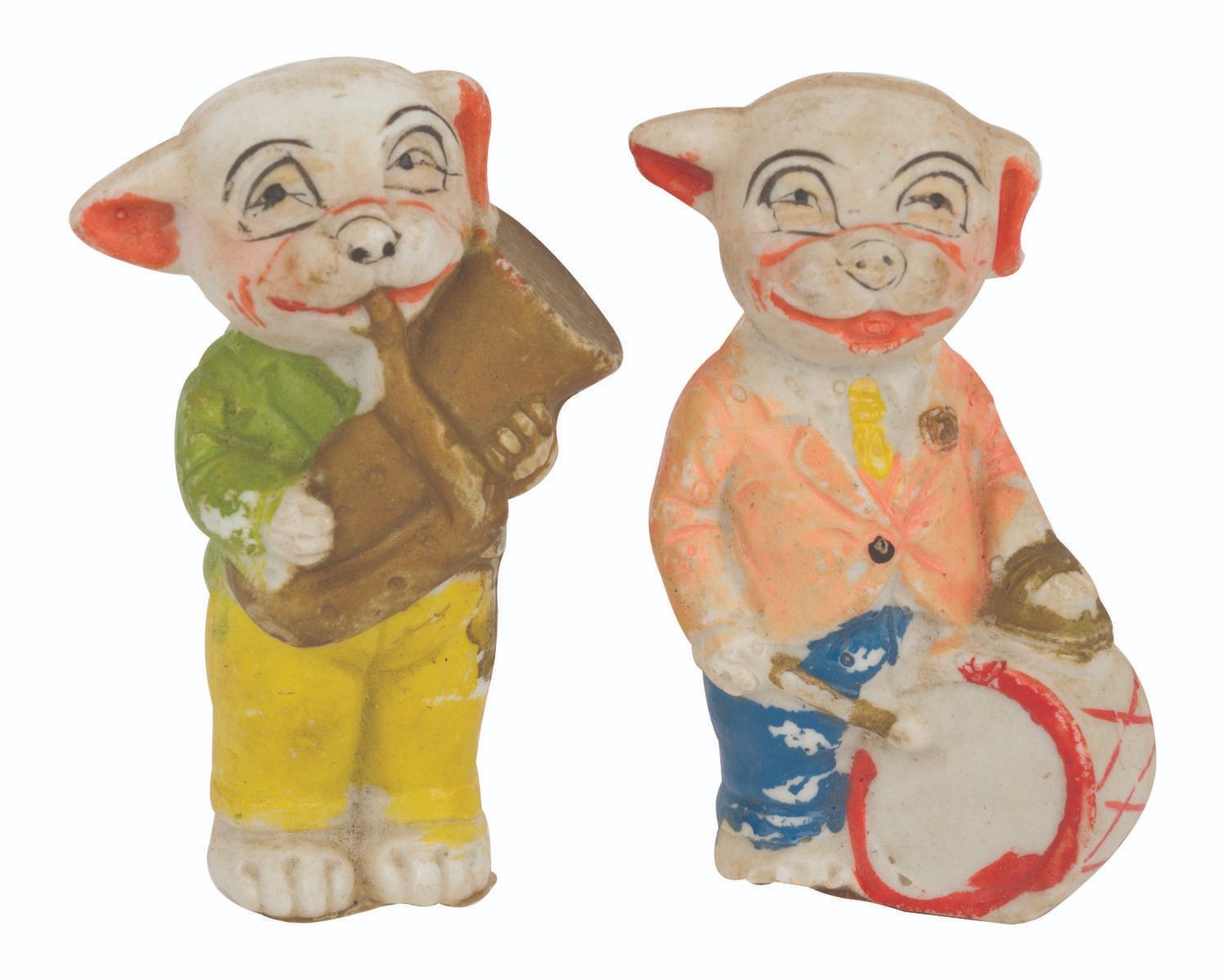 (Borgfeldt, 1920s) A pair of bisque figurines of George Studdy's Bonzo Dog. British comic strip artist George Studdy created Bonzo in 1922. He became popular in England and appeared in several prominent newspapers and magazines. In 1924, he appeared in the first of 26 animated shorts that catapulted him to worldwide popularity. The figures were manufactured in Japan and distributed through the George Borgfeldt Co. Measuring 3" tall, the figurines are in good condition, exhibiting mild dust, a few scuffs, and wear to paint.