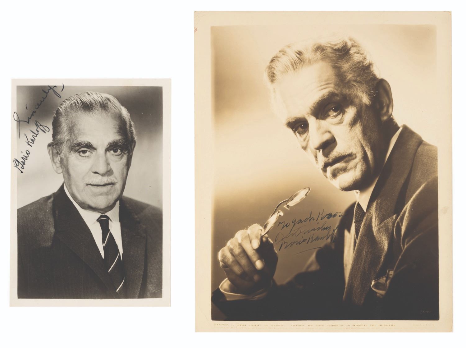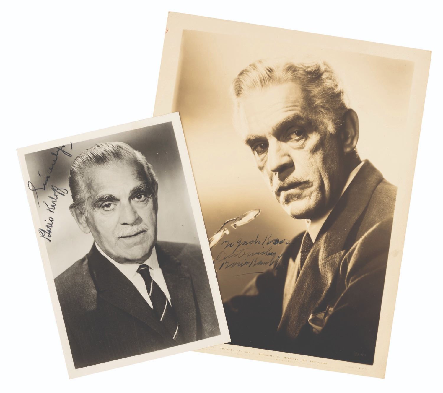 (Boris Karloff, 1950s-60s) A pair of headshots of "Frankenstein” star, Boris Karloff, signed in ink. Measuring 5” x 7” and 8” x 10”, the photos are in very good condition with edge wear and creases to the lower left corners of both.