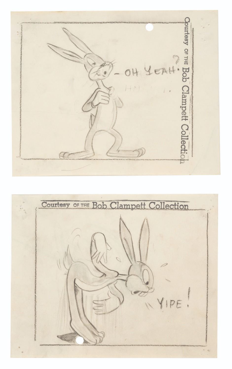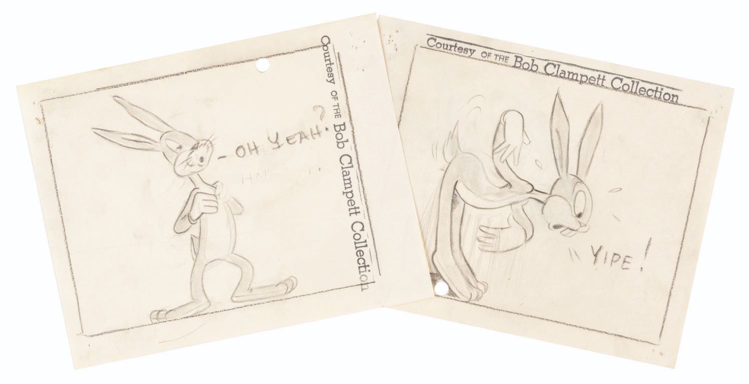 (Schlesinger, 1941-43) A pair of storyboard panels from an unknown short featuring Bugs Bunny. Accomplished in graphite and measuring 4.75” x 6” each, the panels are in good production-used condition, stamped “Courtesy of the Bob Clampett Collection,” with edge wear, creasing, pinholes, and light discoloration from age.