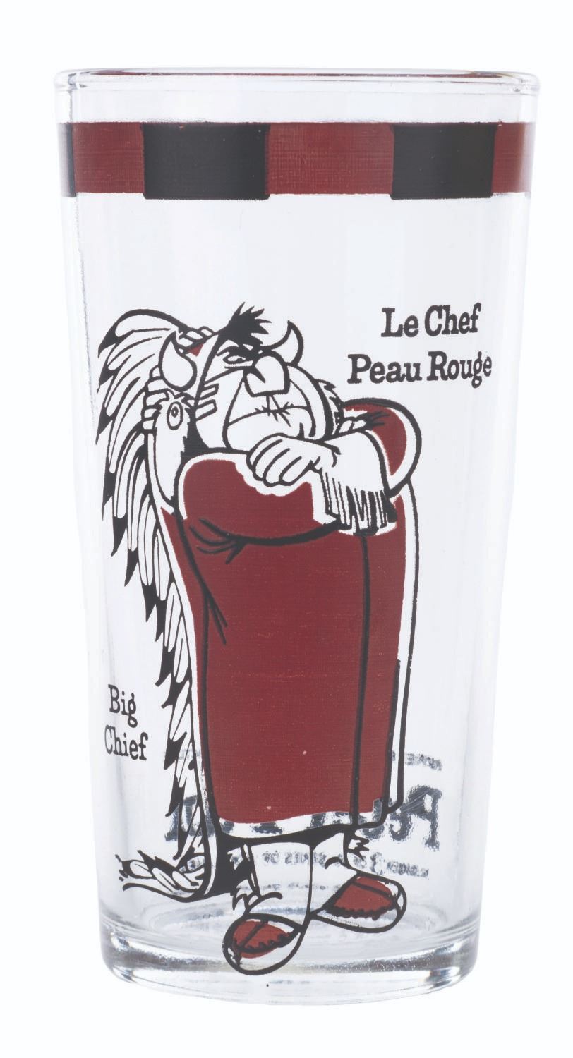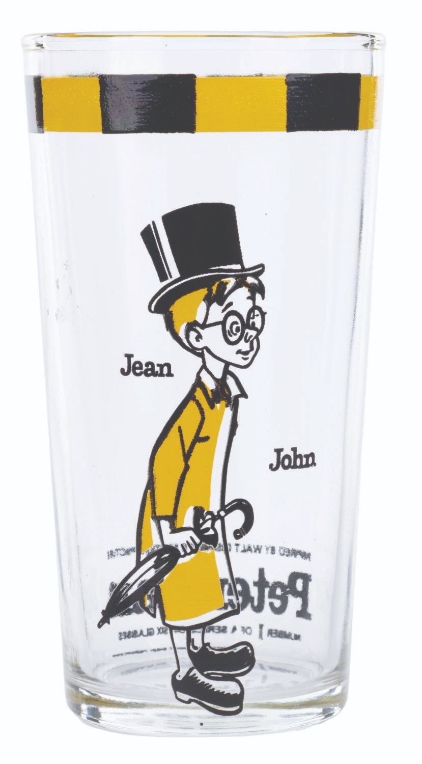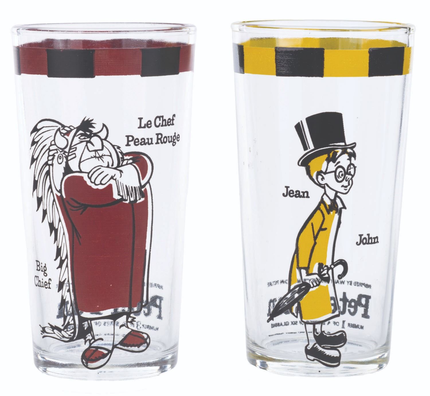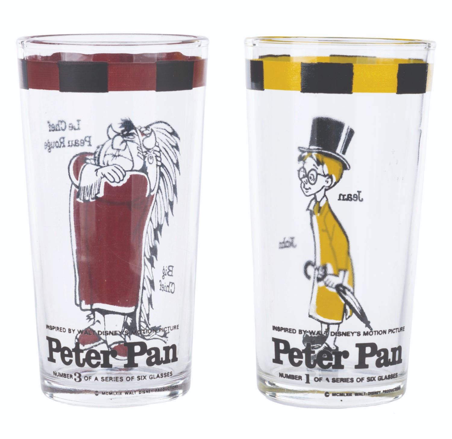 (Disney, 1969) A pair of Canadian promotional glasses for the 1969 re-release of “Peter Pan.” These French-language glasses are numbers 1 and 3 in a 6-glass set and feature Big Chief “Le Chef Peau Rouge” and John “Jean.” Measuring 5” tall and 2.5” in diameter, the glasses are in very good condition with heavy scratches, minor paint loss, and wear.