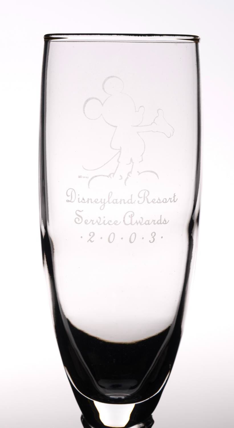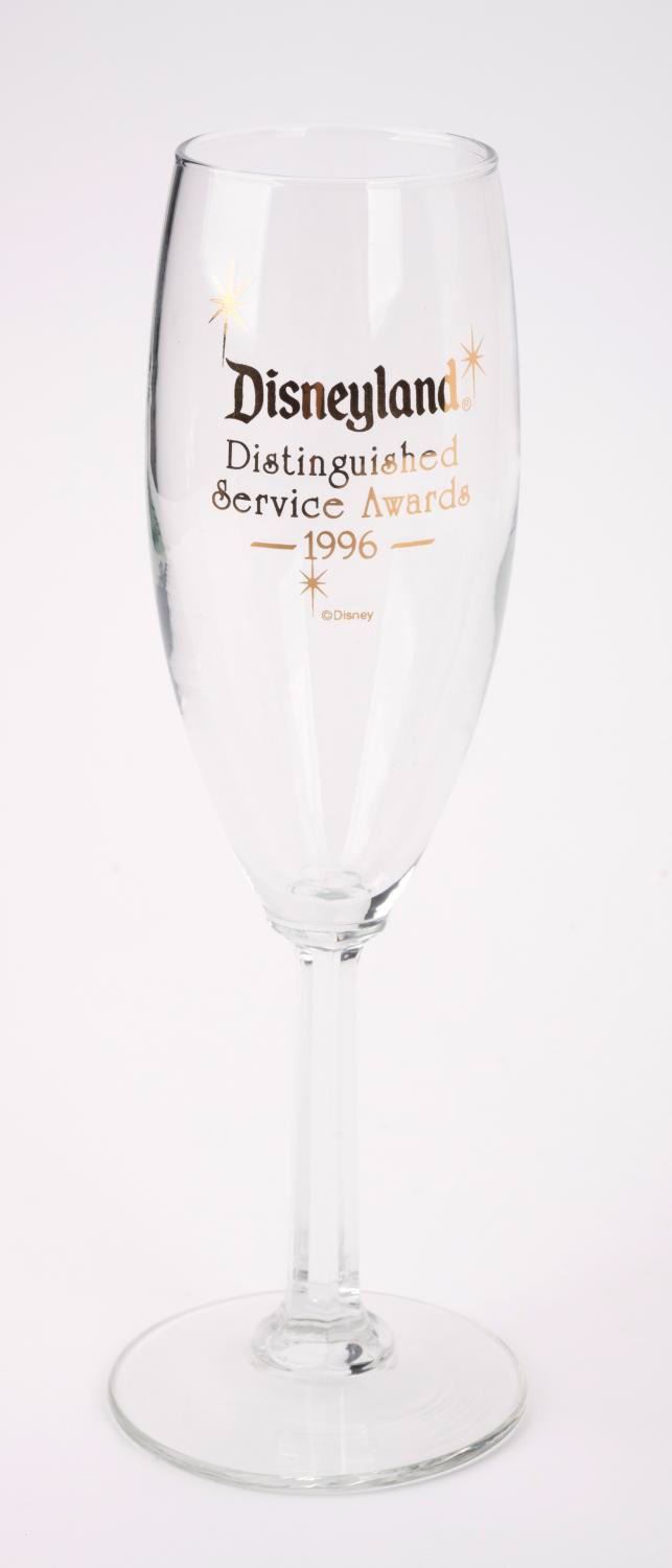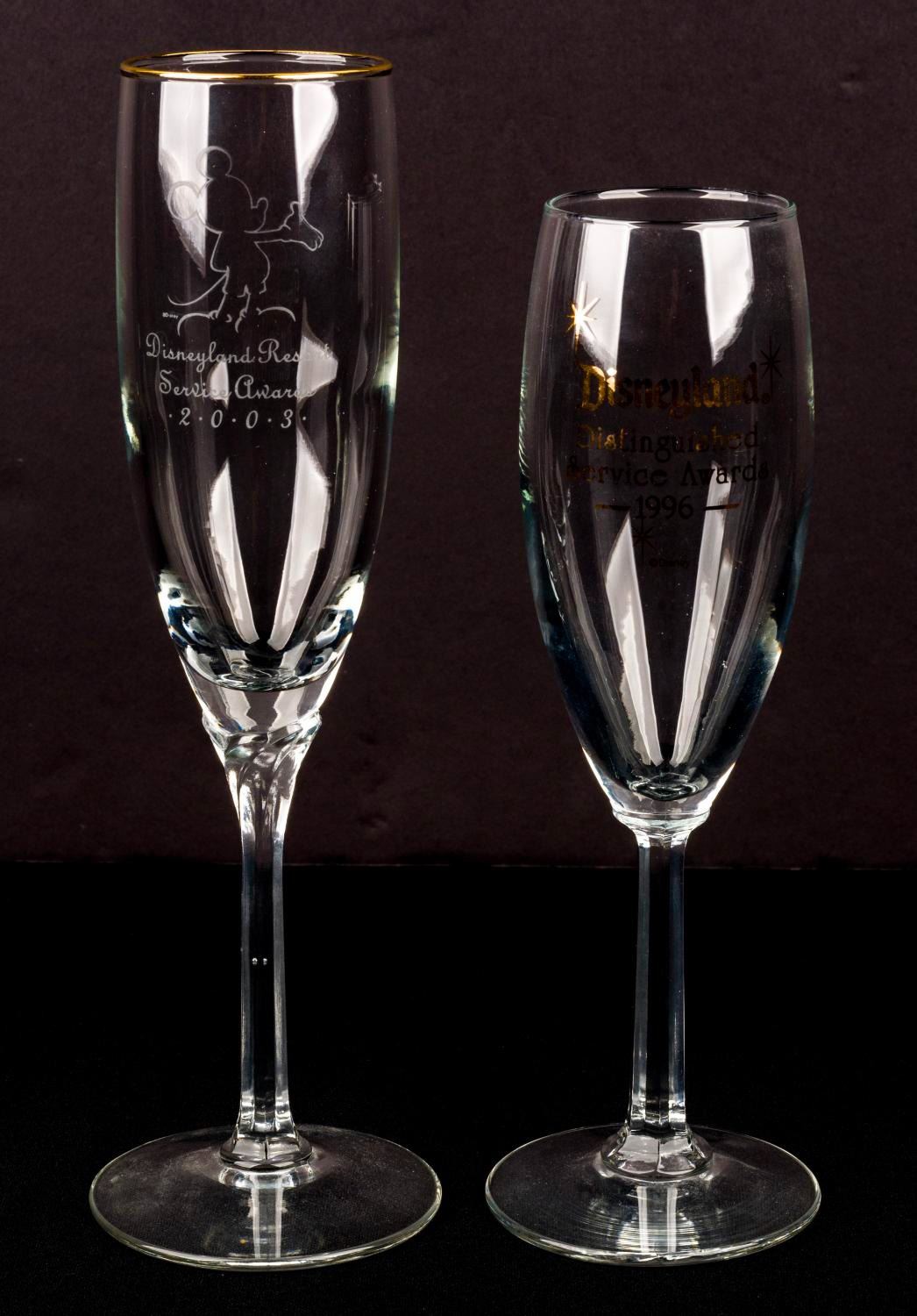 (Disneyland, 1996/2003) A pair of Disneyland Champagne Glass souvenirs given to cast members attending the distinguished service award banquets in 1996 and 2003. Both glasses are in fine condition.