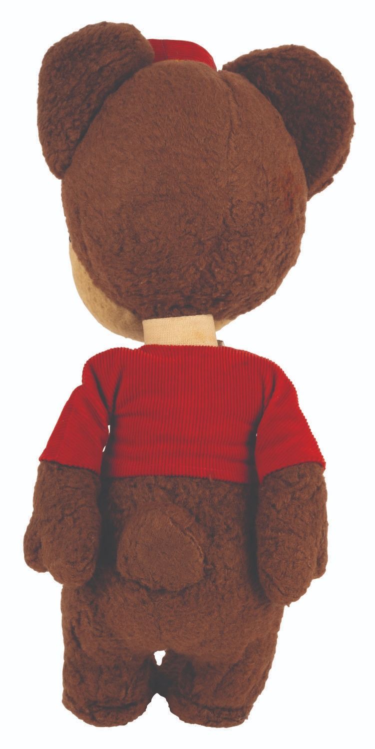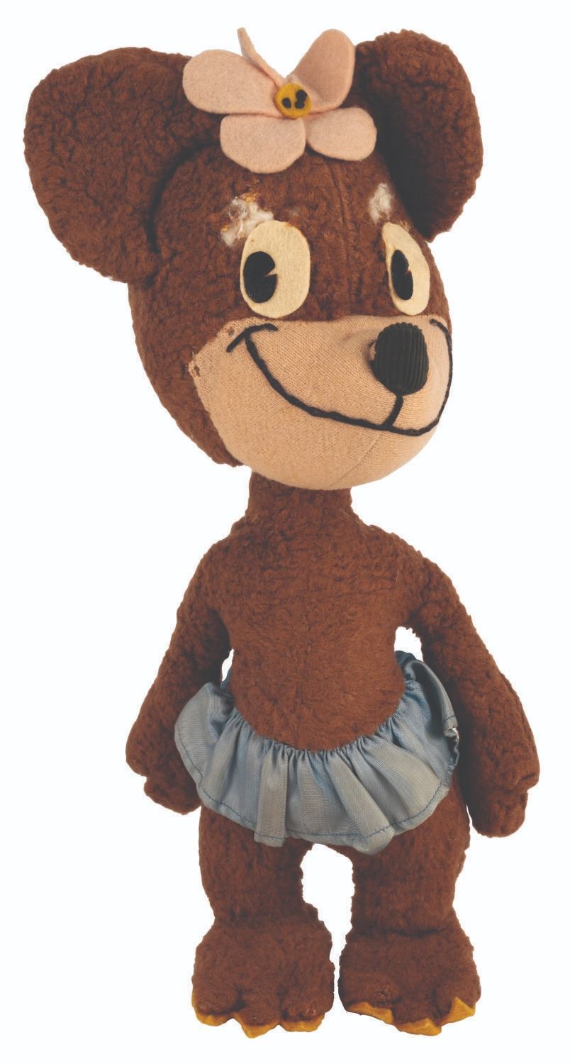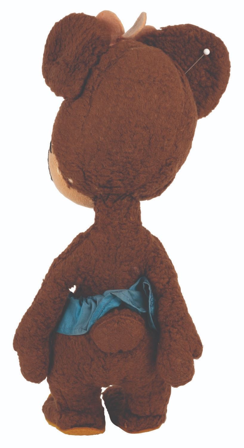 (Charlotte Clark, 1940s) An extremely rare pair of handmade Bongo and Lulubelle Dolls by Charlotte Clark. The dolls come from Clark's personal collection and were given to relatives in the 1950s. Both dolls stand 13" tall and are made of a textured brown material resembling bear fur. Bongo has a corduroy hat and jacket. Lulubelle has a yellow felt flower and a ruffled blue fabric skirt that is slightly faded. Lulubelle has some material loss around her eyes and nose. Bongo has light general wear throughout, but he is in extremely fine condition with no serious defects. The pair are the only examples of these characters we have seen by Charlotte Clark.