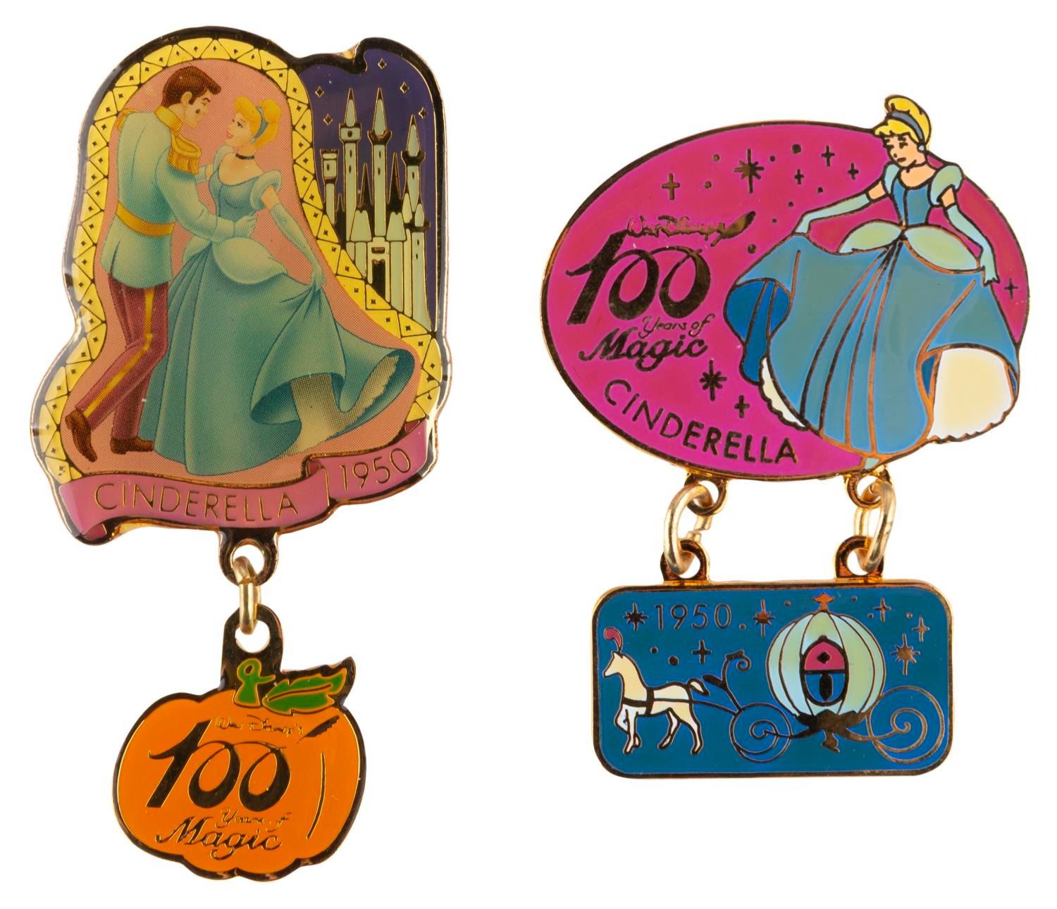 (Disney, 2001) Two "Cinderella" pins from the 100 Years of Magic celebration, both with a dangle feature and released in limited editions of 3000. The pins are in very good condition with typical slight color shift to the dancing pin.