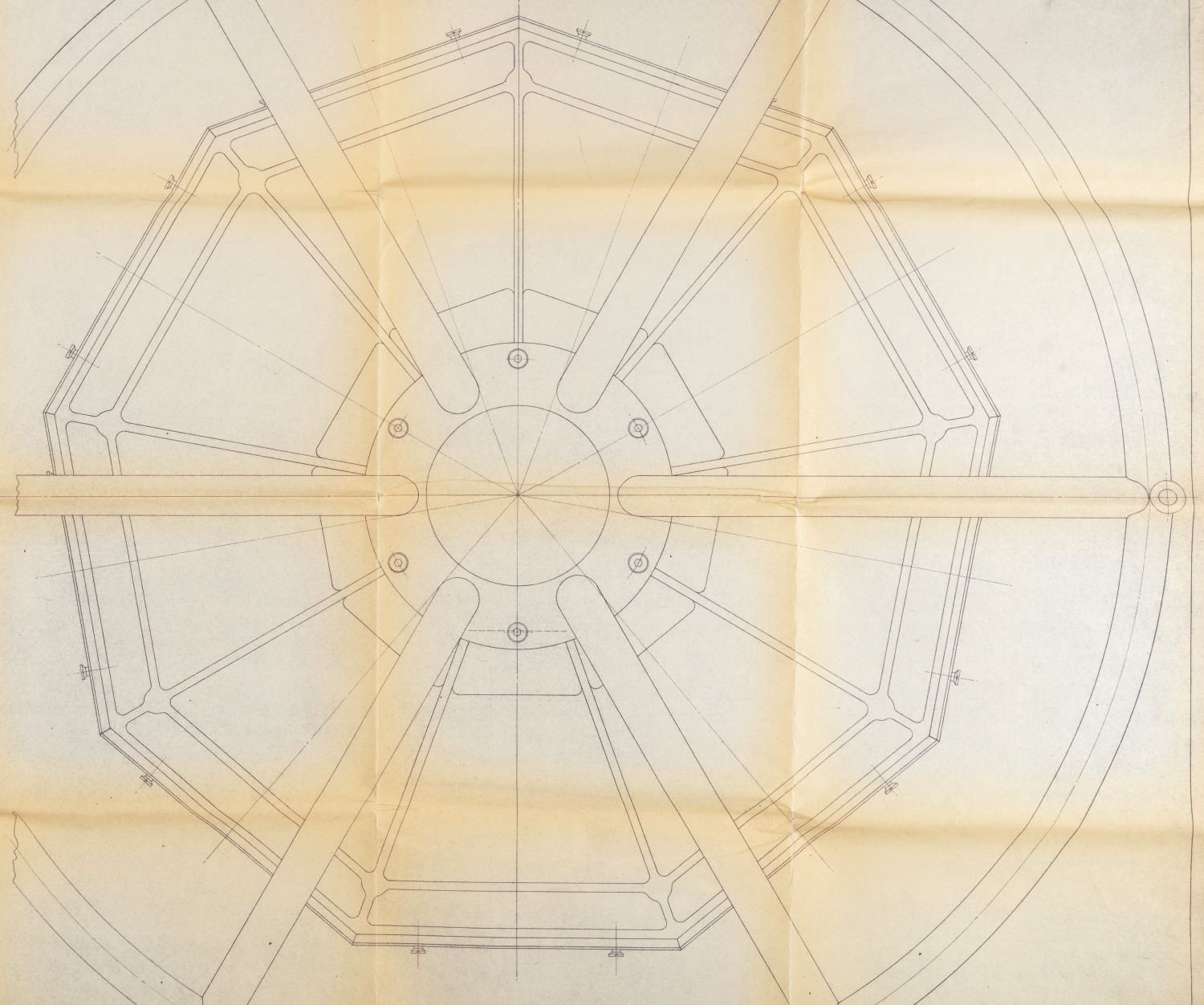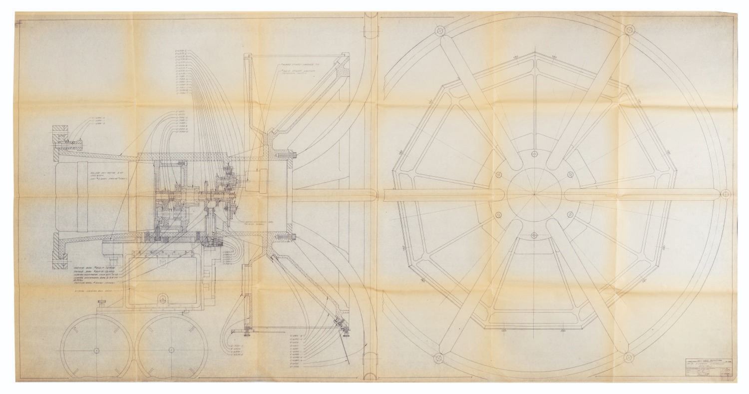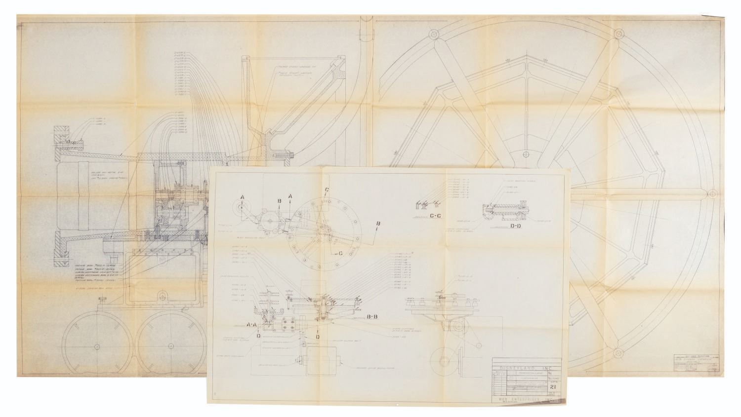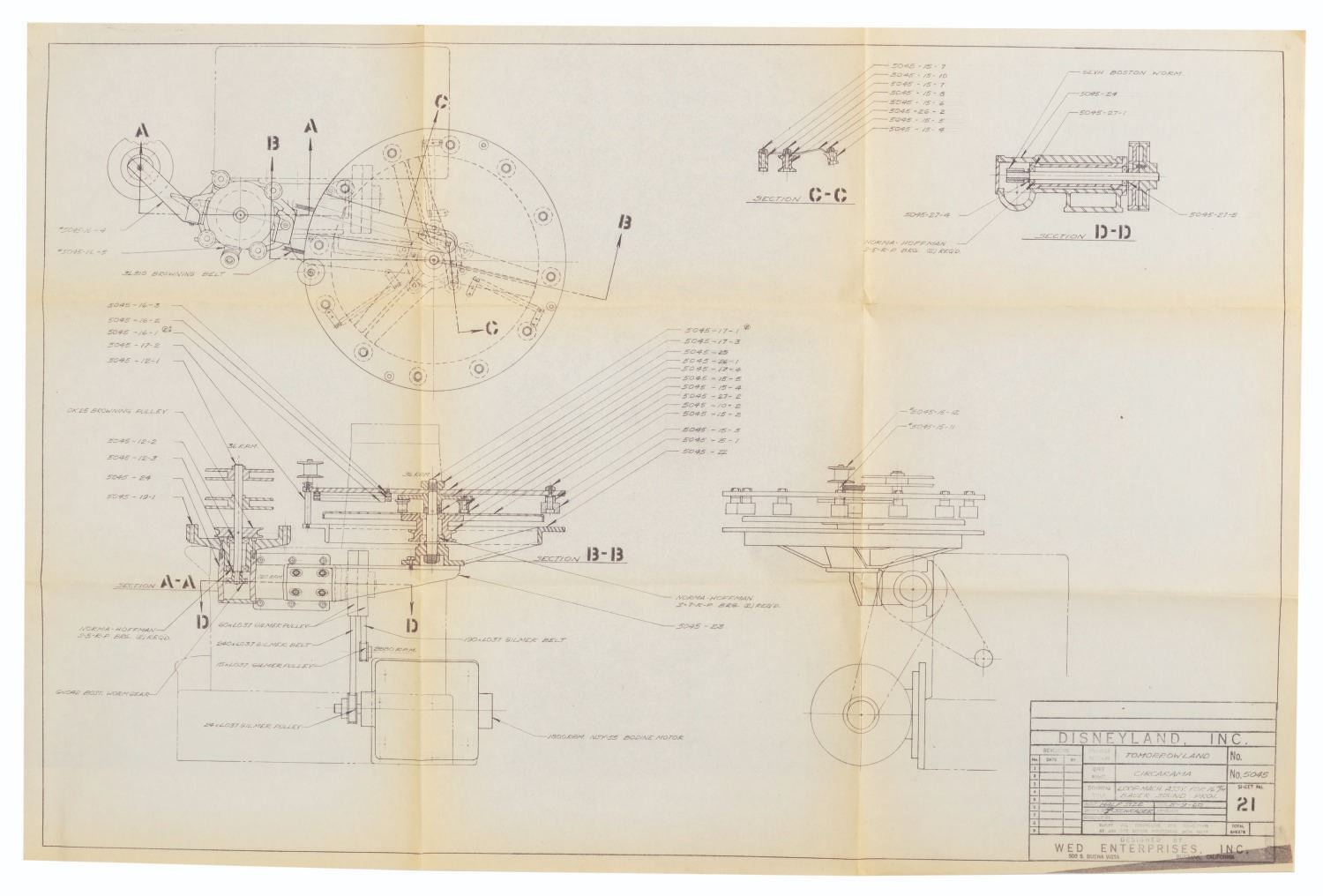 (Disneyland, 1960-62) A pair of brownlines for Tomorrowland's Circarama. Dated 1960 and 1962, these feature the Circarama’s nine-camera filming rig and its theatrical projection system. The 360-degree motion picture experience, developed by Ub Iwerks, Roger Broggie, and Bob Otto, was renamed Circle-Vision 360 to avoid confusion with Cinerama. Measuring 24" x 36" and 36" x 70", the brownlines are in very good condition with some minor wear to the fold lines and edges from use.