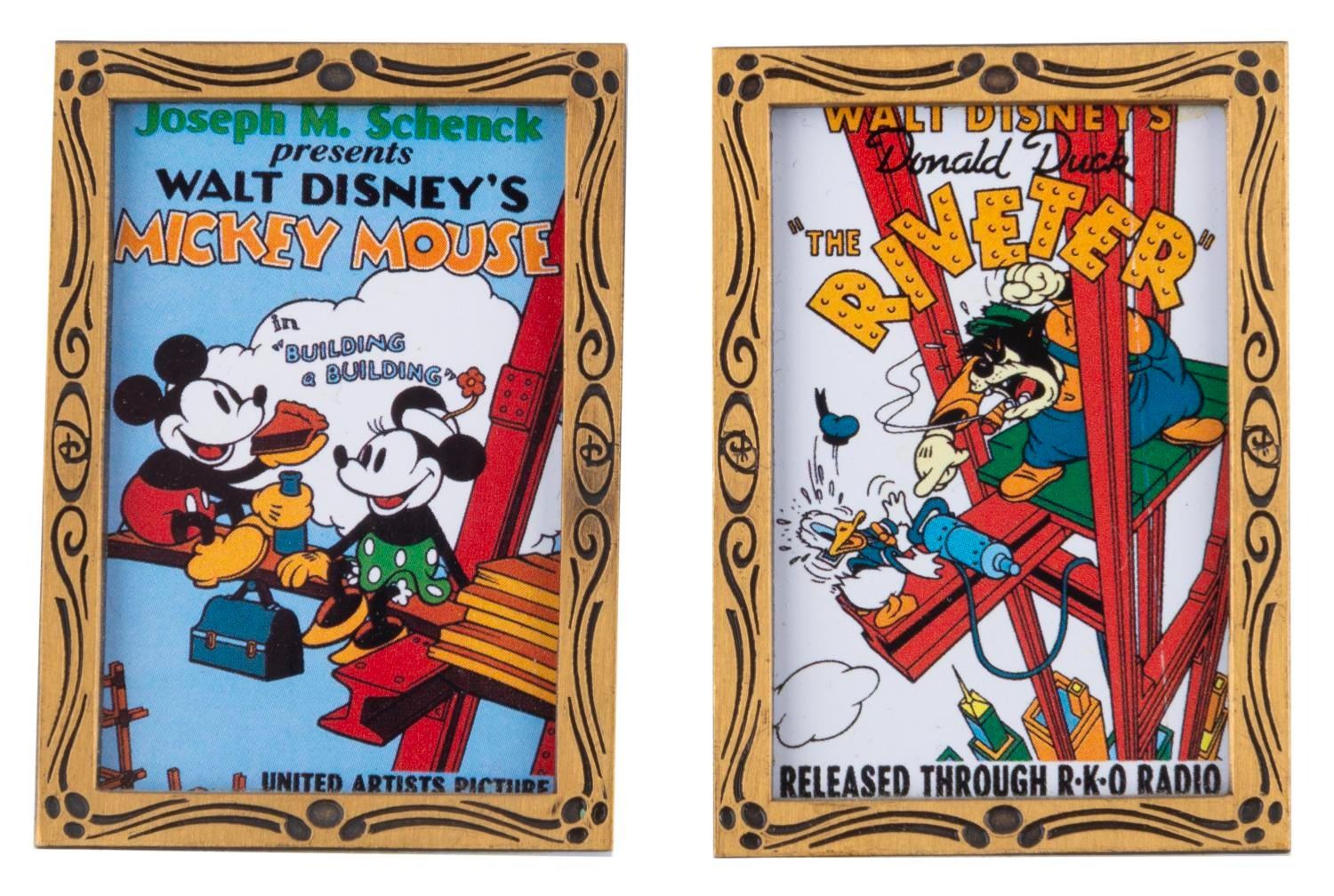 (Walt Disney World, 2000) A pair of large pins of posters for the cartoons "Building a Building” and "The Riveter,” each released in a limited edition of 3,000 at Walt Disney World in the "Nostalgia Movie Poster” series. Measuring 1.5” x 2”, the pins are in very good condition.
