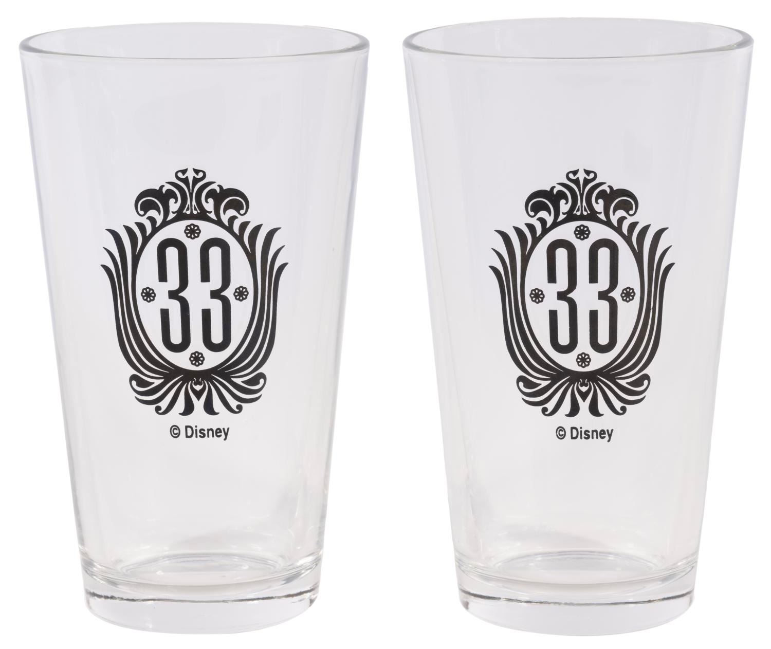 (Disneyland, 1990s-2000s) A pair of pint glasses featuring the original logo of Club 33. Measuring 3.5" in diameter and 5.75" tall, the glasses are in fine condition with one displaying a minor imperfection to the left of the Disney copyright.