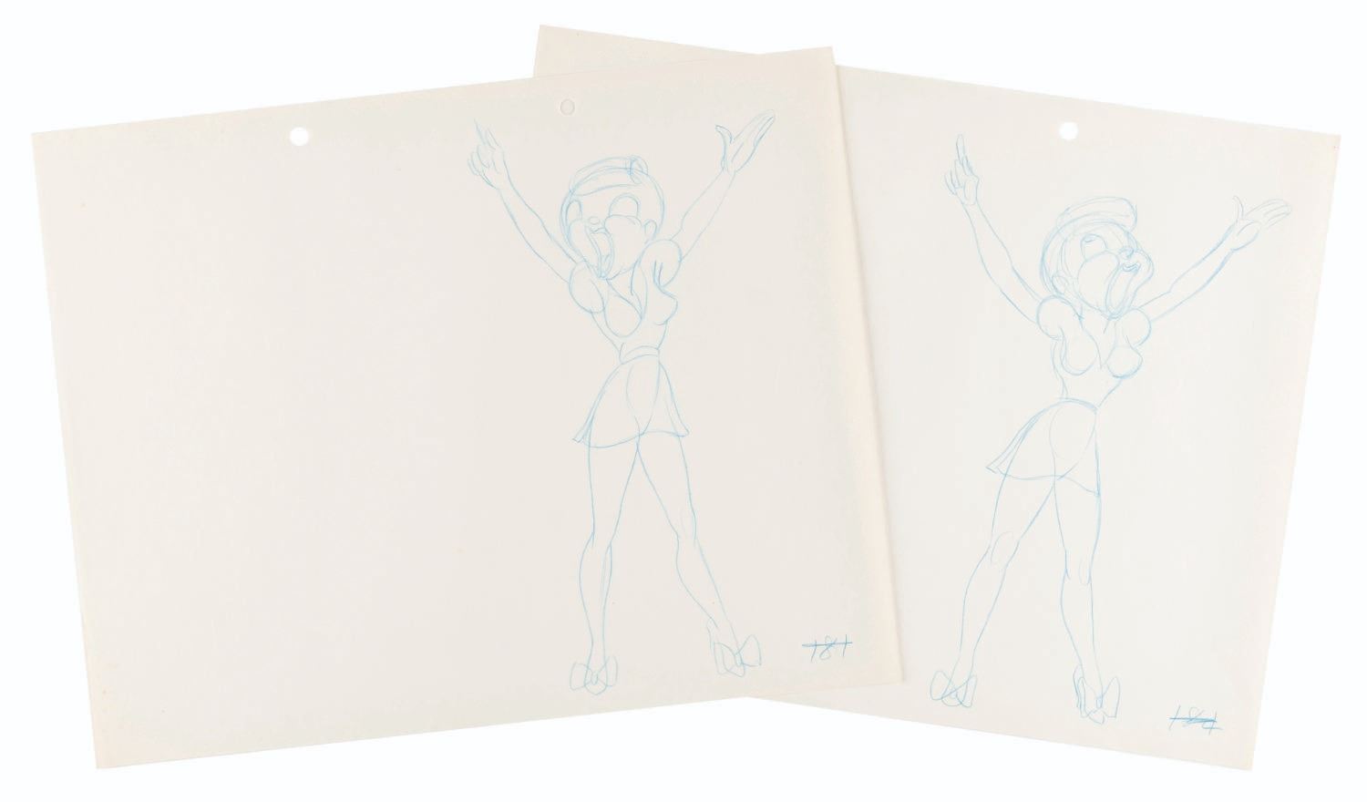 (Schlesinger, 1943) A pair of production drawings of So White from "Coal Black and de Sebben Dwarfs." Accomplished in colored pencil with image sizes measuring 4.75" x 8.75" and 5.25" x 8.5" on 9.5" x 12" animation paper, the drawings are in very good condition with light creases and spots of discoloration from production use and age.
