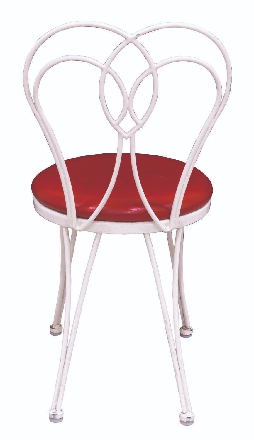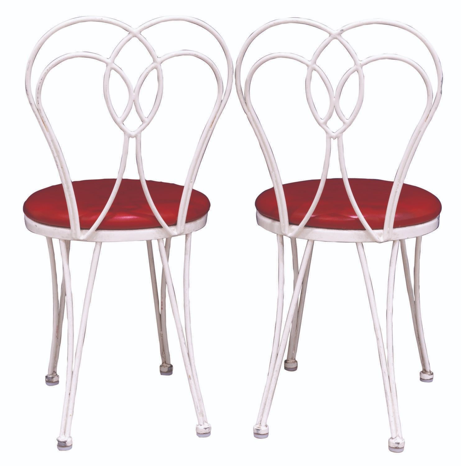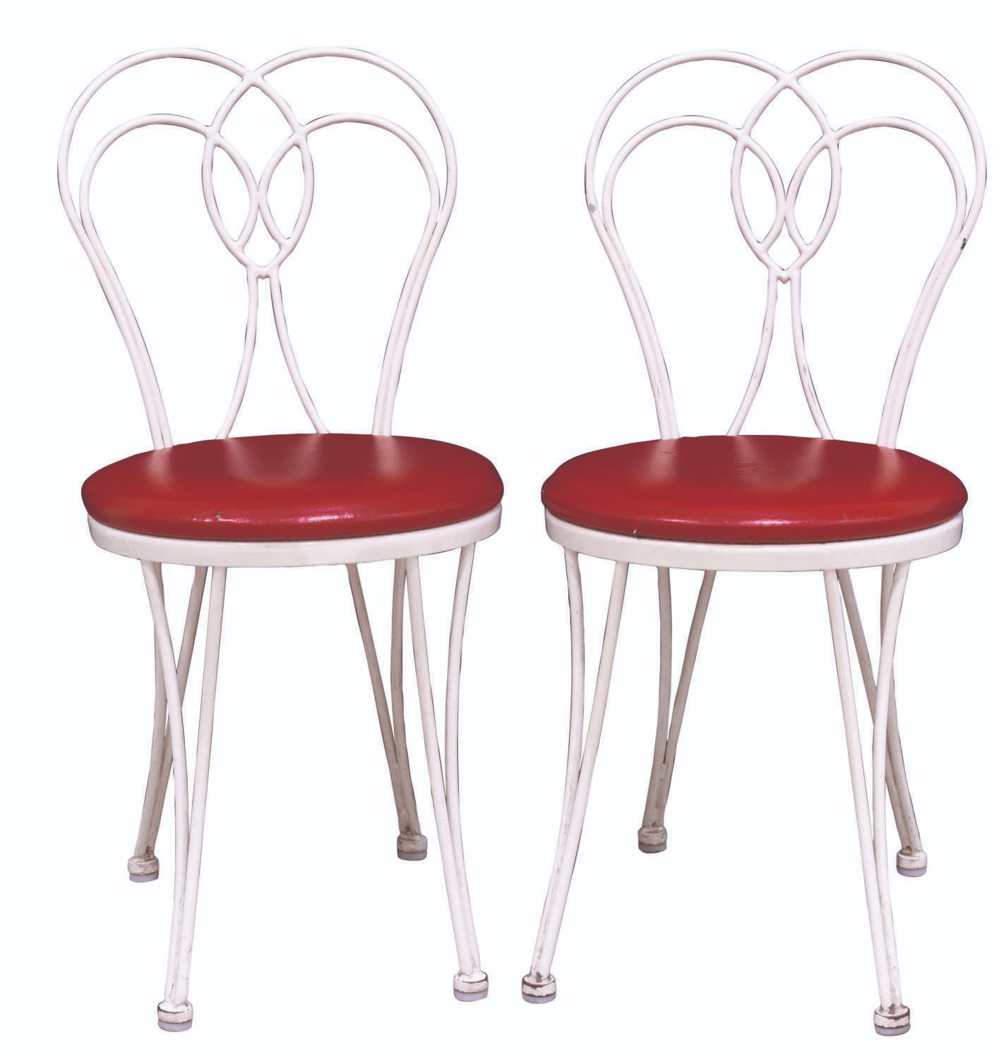 (Disneyland, 2000s) A pair of Guest chairs from the Coca-Cola Refreshment Corner on Main Street, U.S.A. Measuring 19" x 17" x 35" tall each, the chairs are in good condition with expected wear from Park use, including scuffs, scratches, paint loss up to 3", and light tears to the seat cushions. Due to size and weight, this lot requires special shipping arrangements. Please inquire before bidding.