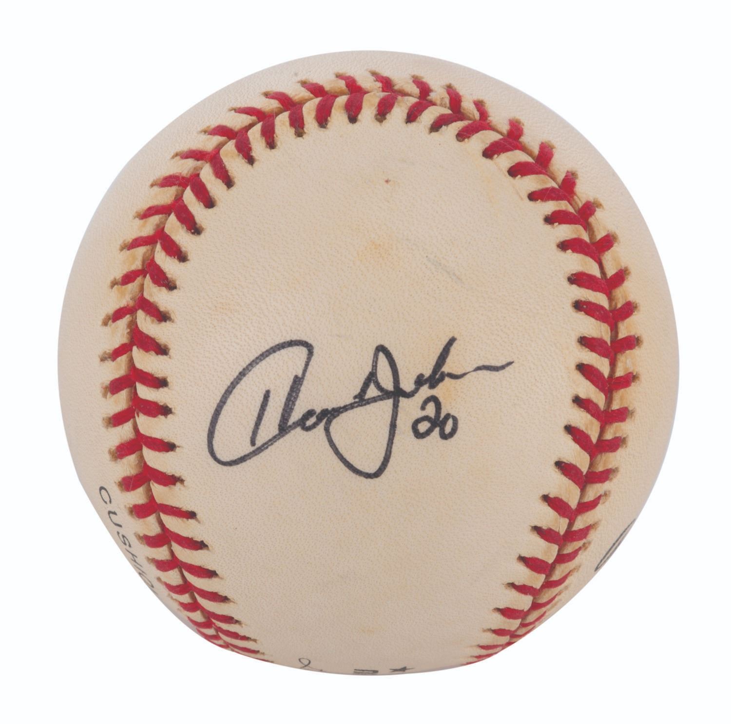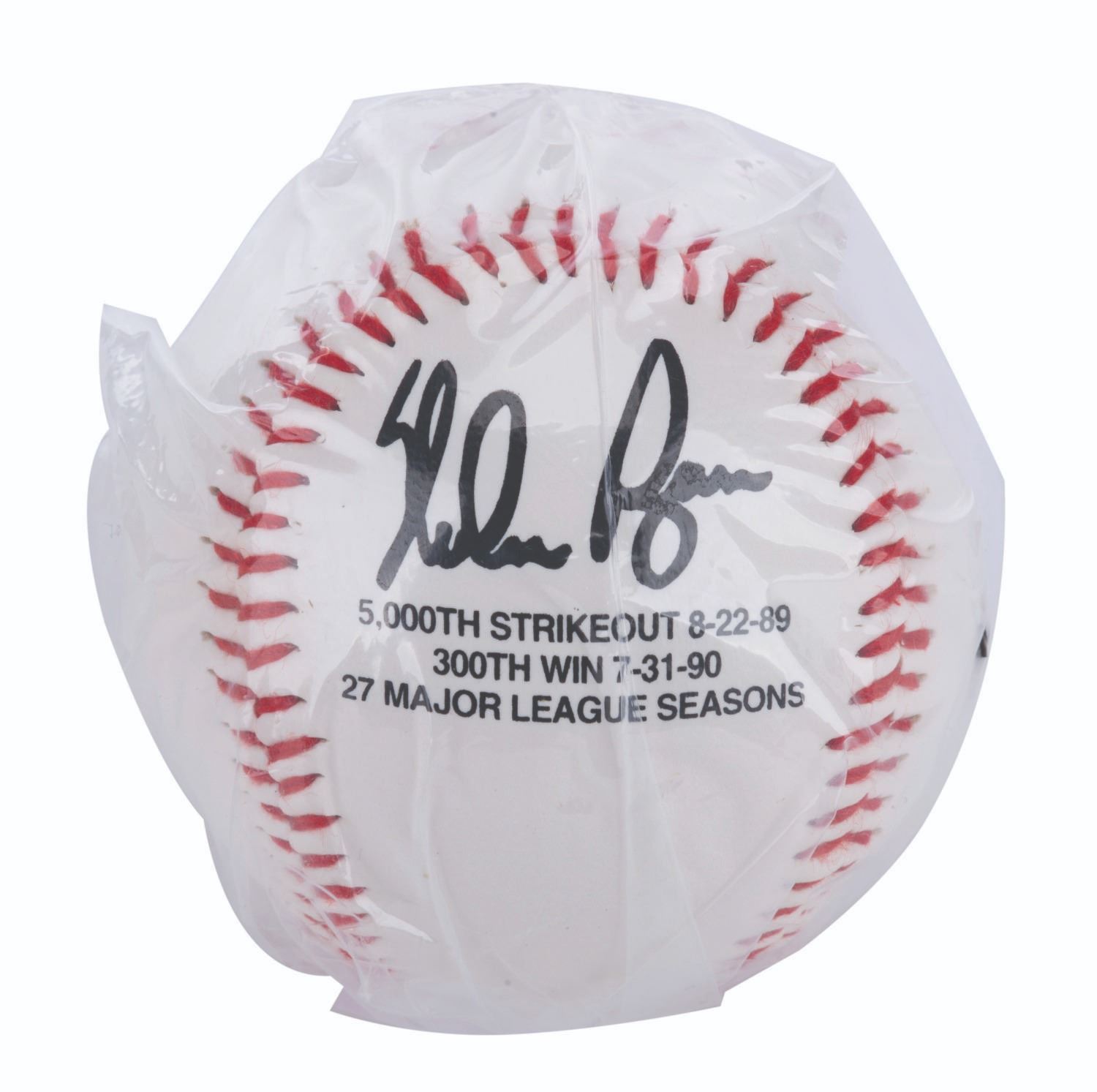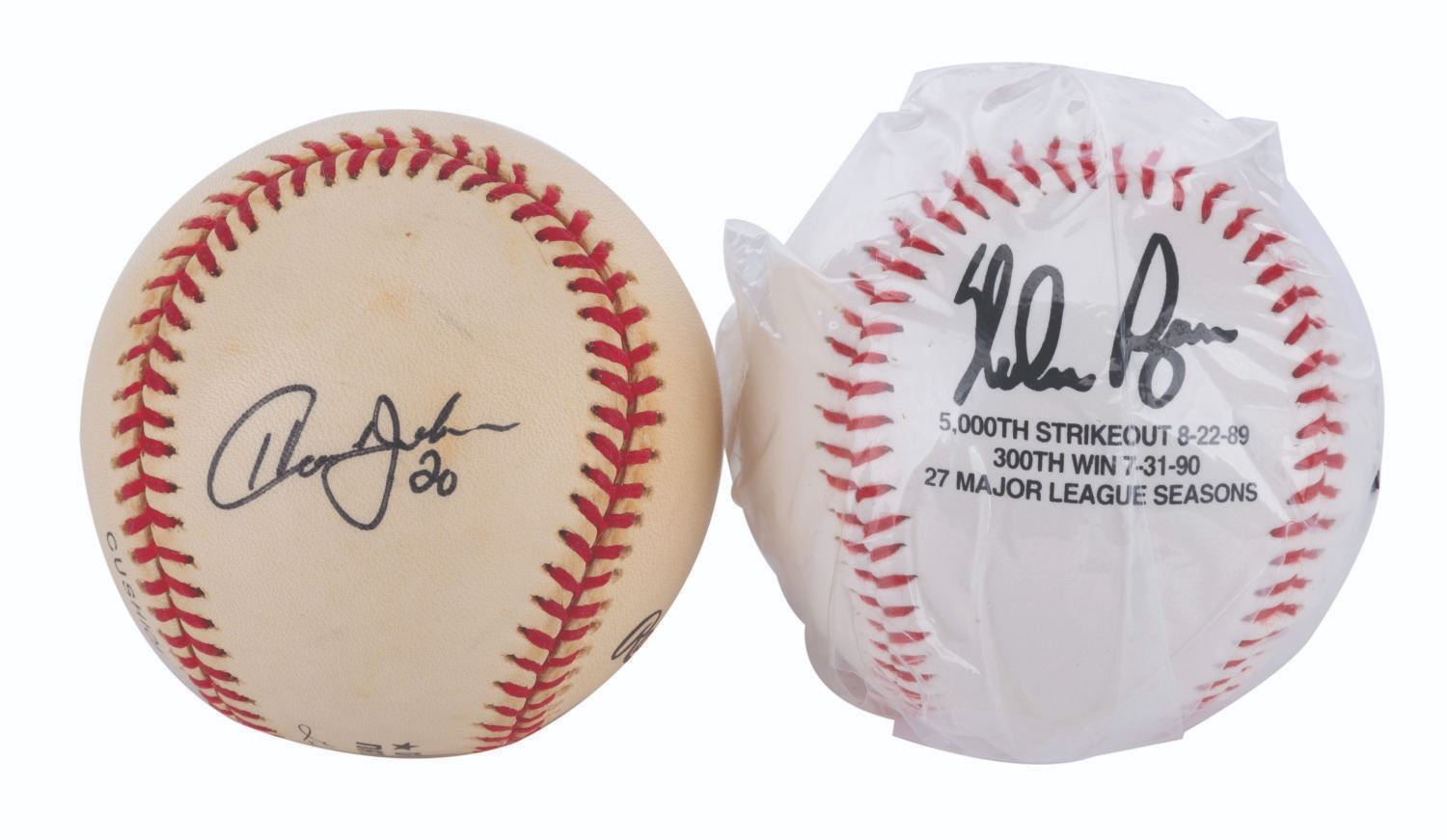 (1989-2000) A pair of collectible baseballs. One is signed by Howard Johnson, World Series player for the 1984 Detroit Tigers and 1986 New York Mets. The second commemorates Nolan Ryan's 5,000th strikeout on 8/22/89, with a facsimile of his signature. Both standard ball size just under 3", the Howard Johnson ball is in very good condition with light wear from handling and age. The Nolan Ryan commemorative ball is in fine condition.