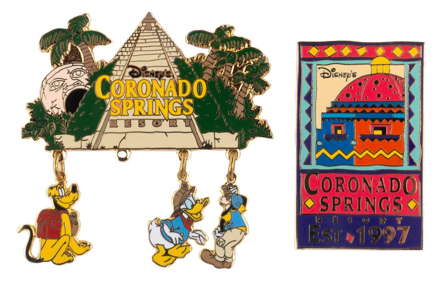 (Disney’s Coronado Springs Resort, 2000/2002) Two pins celebrating the Coronado Springs Resort, featuring the original logo and a pyramid with dangle features of characters. The logo pin is in fine condition, and the pyramid displays in good condition, missing the Mickey dangle.