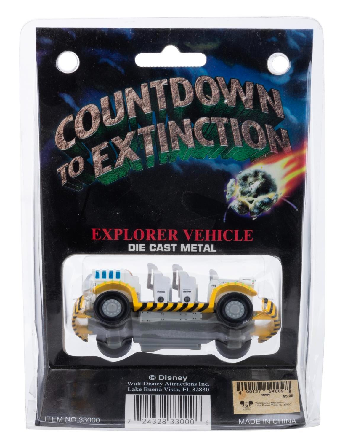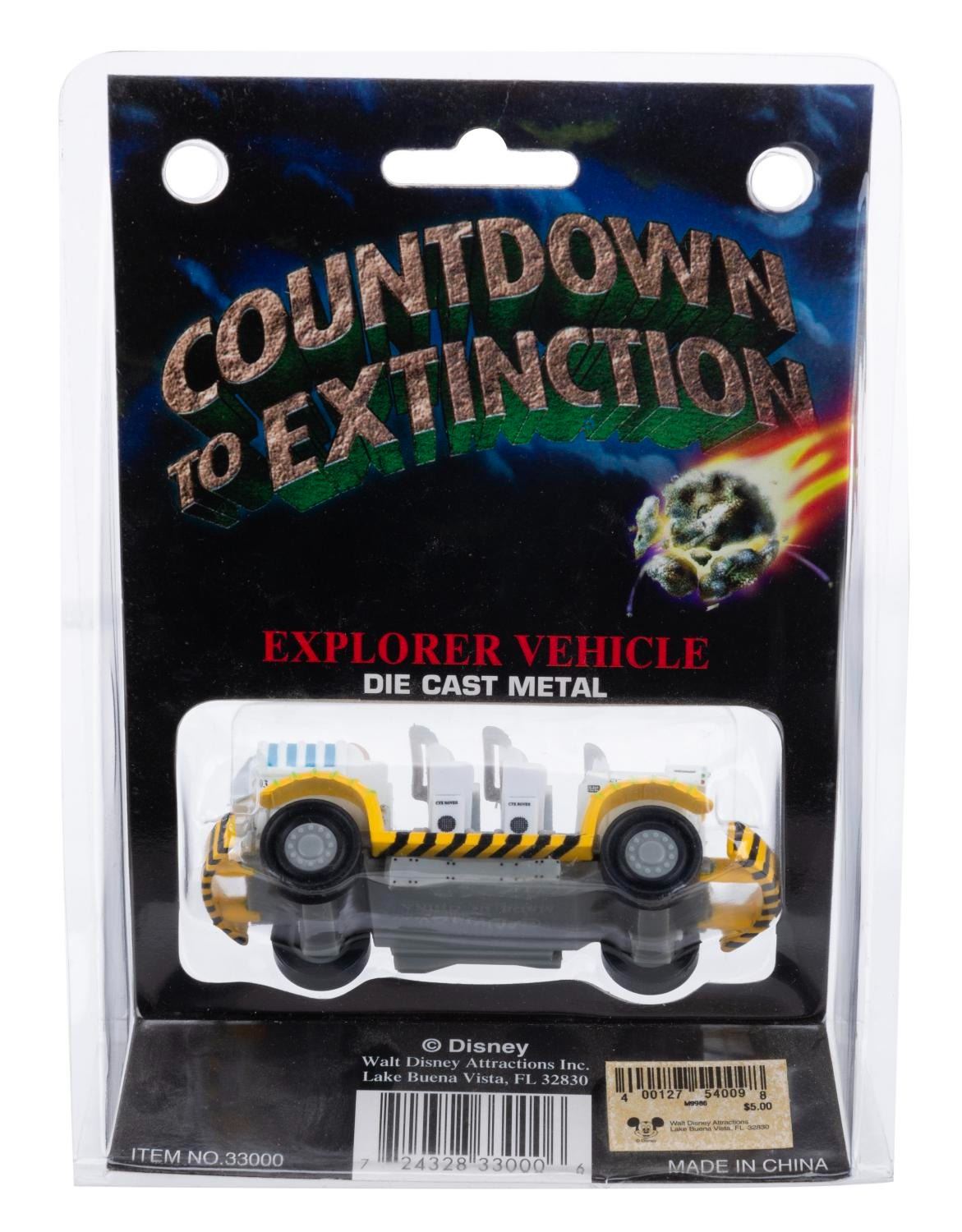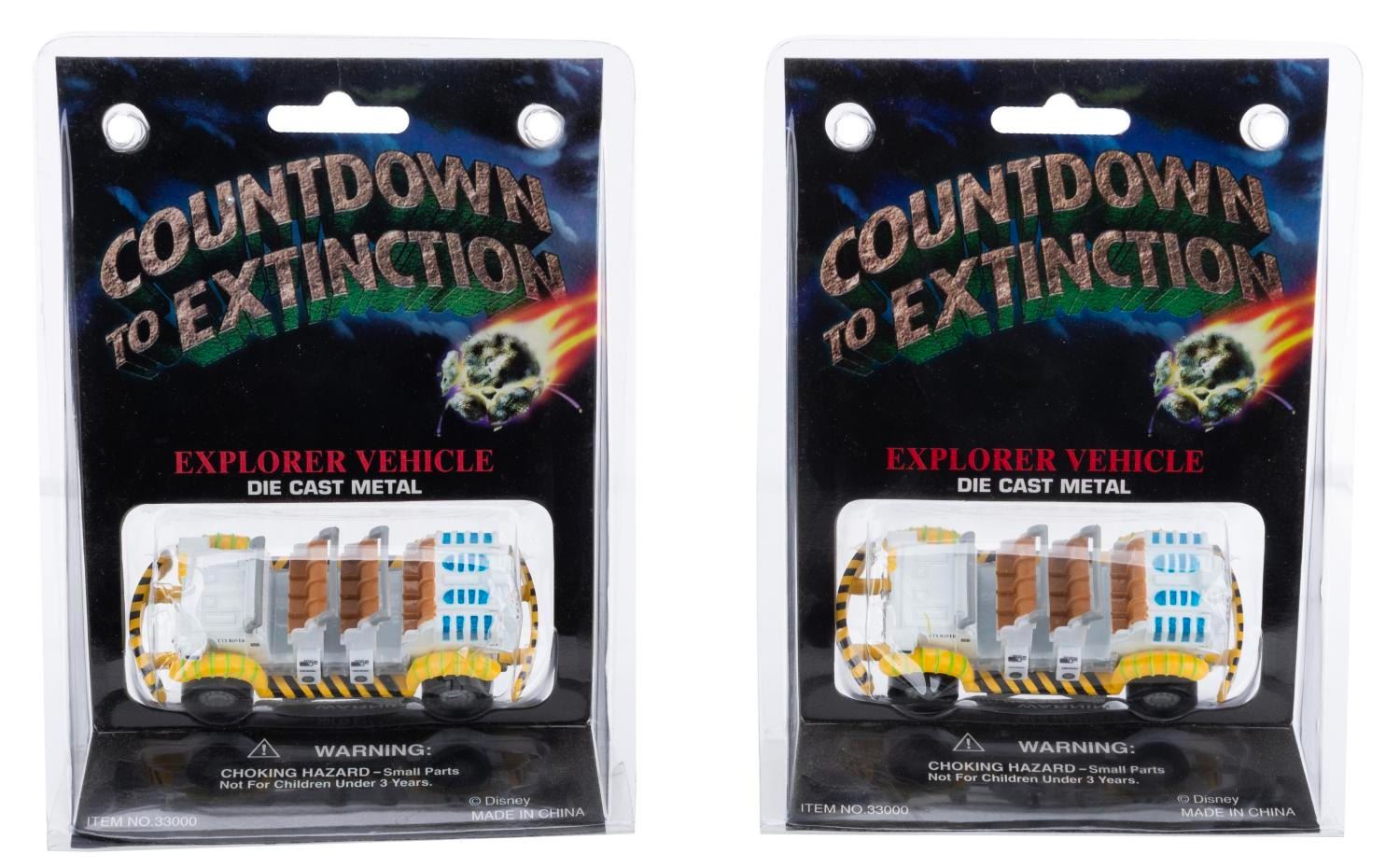 (Disney’s Animal Kingdom, 1998) A pair of die-cast metal ride vehicles in the original packaging based on the Countdown to Extinction attraction. In 2000 the name changed to Dinosaur after the release of the feature film of the same name. Measuring 4” long in their 5.5” x 7.5” original packaging, the toys are in fine condition.