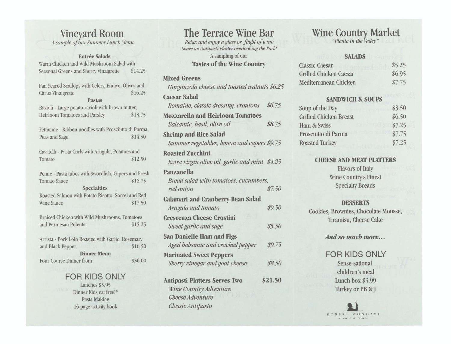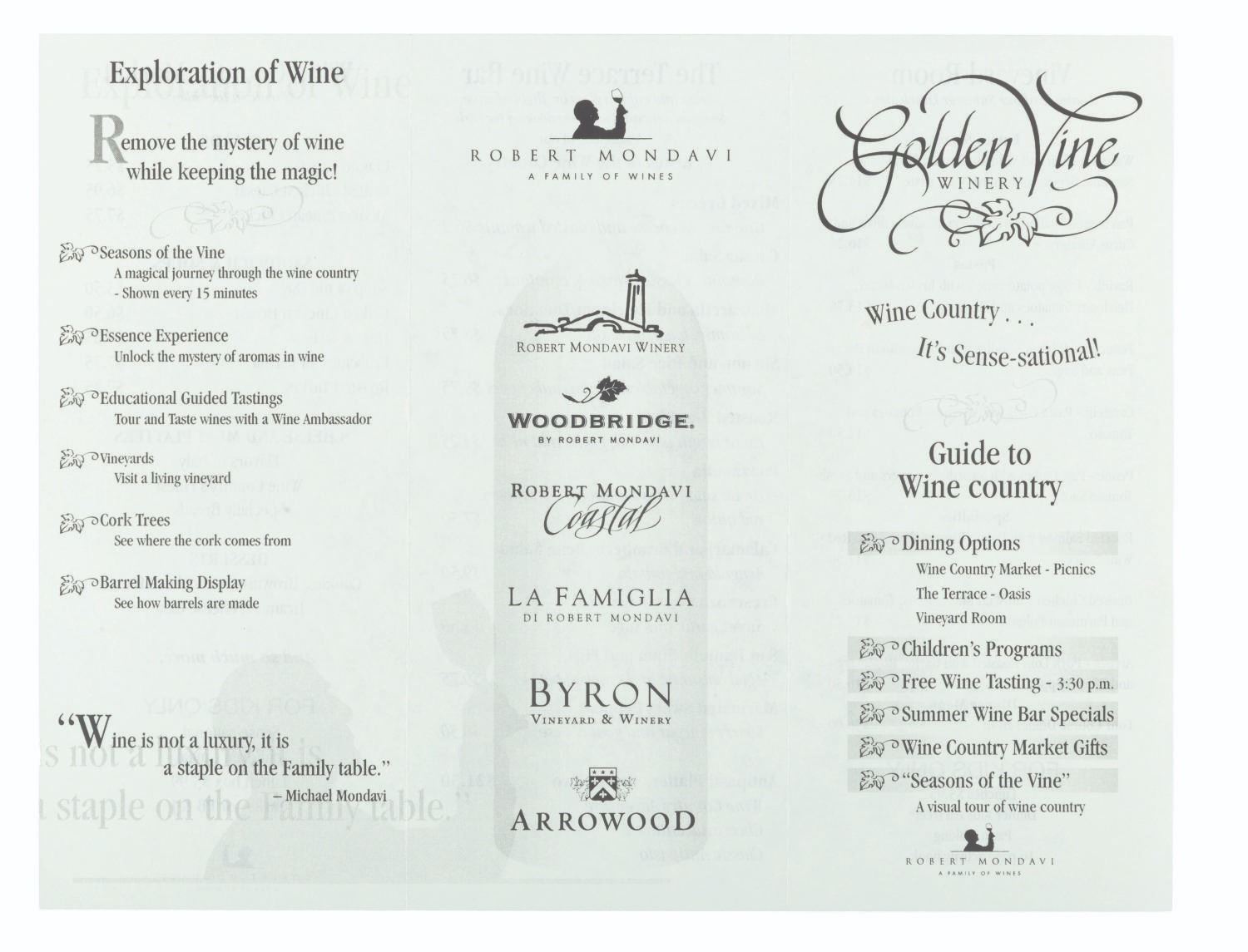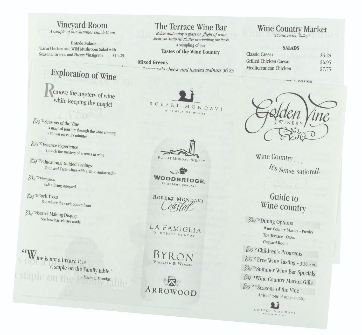 (Disney’s California Adventure, 2001) A pair of opening year tri-fold menus from the Golden Vine Winery at Disney’s California Adventure. The restaurant was originally sponsored by the Robert Mondavi Family, with Disney taking over by the end of 2001. Each measuring 8.5" x 11", the menus display in very good condition with light wear along the original folds.