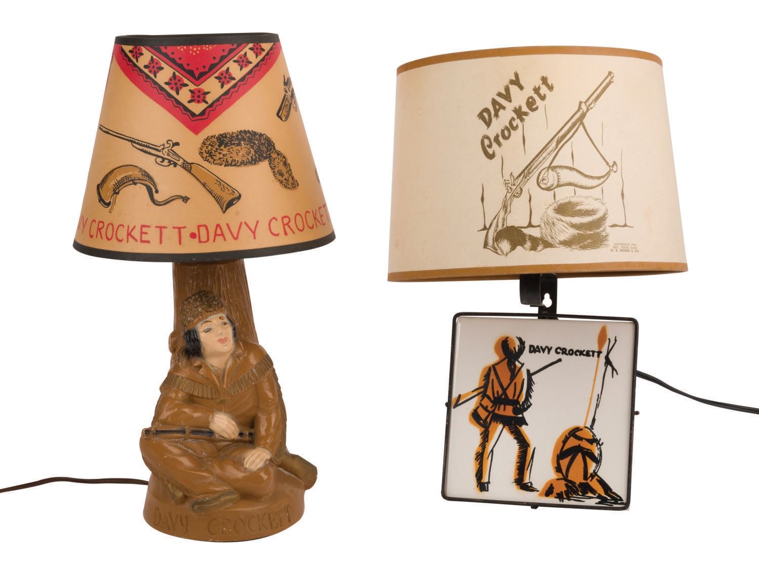 (Danisoburg/H.R. Becker/Metro Art, 1950s) A pair of Davy Crockett lamps manufactured by Metro Art and H.R. Becker & Danisoburg. One lamp is composed of a metal frame, with a hand-painted glazed "Danisoburg" tile of Davy Crockett, and H.R. Becker & Co. lampshade. The other lamp features a Metro Art figural base with lampshade by an unknown manufacturer. Measuring 11" and 14.25" tall, the lamps are in good condition with scuffs, oxidation, minor spots of discoloration, fading, and wear.