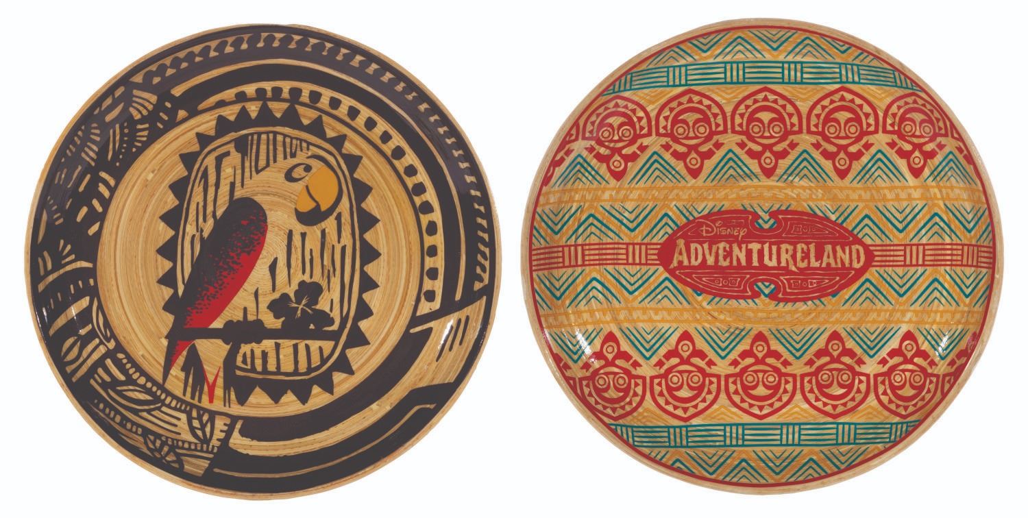 (Disney Parks, 2014) A pair of decorative plates featuring Adventureland imagery, including Jose from the Tiki Room, and the "Maui" mascot seen in the Polynesian Resort at Walt Disney World. Measuring 9" in diameter, the bamboo wood plates are in very good condition with light wear.
