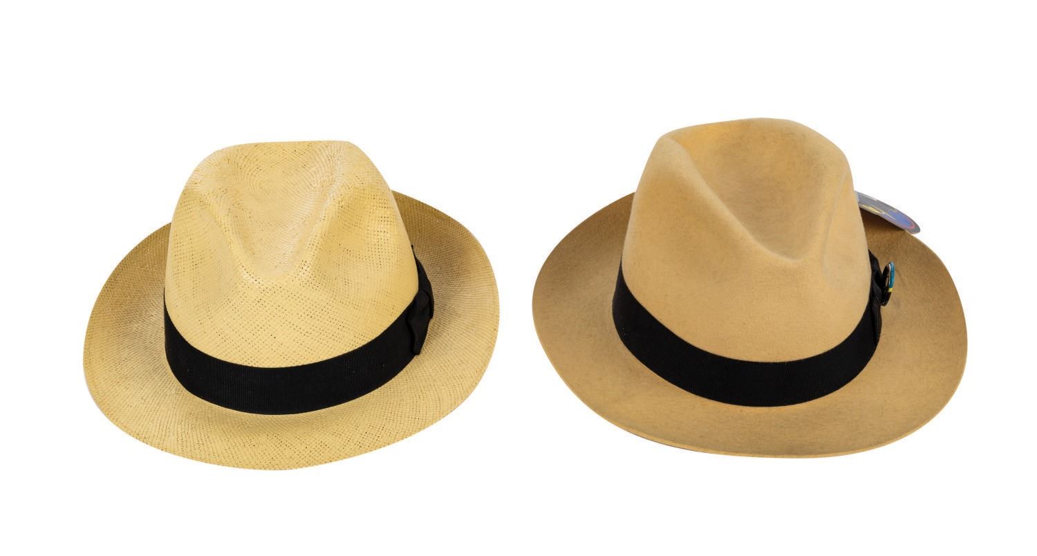 (Disneyland/Disney-MGM, 1990) A pair of souvenir Dick Tracy hats from Disney Parks. The pair of hats were offered at merchandise locations in conjunction with the Diamond Double Cross stage show at both Disneyland and Disney-MGM Studios. The wool hat has a Dick Tracy button attached to the ribbon and retains original tag featuring the film's logo. The straw hat also retains its original tag. Each hat measures a size extra-large and is in fine condition.