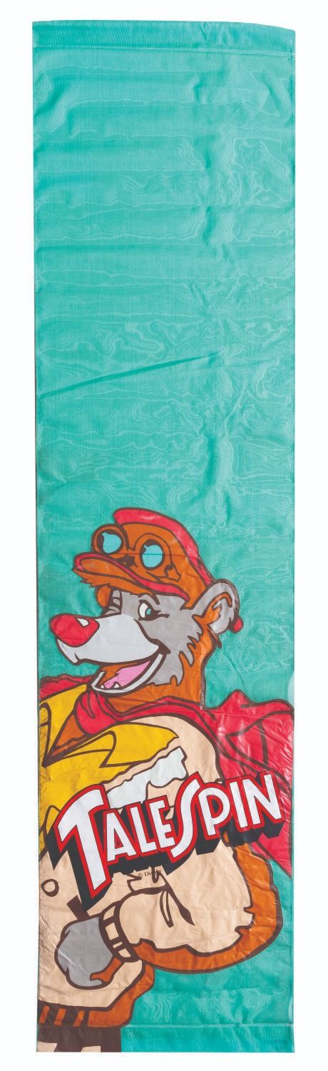 (Disneyland, 1990s) A large pair of banners for the popular ’90s children’s entertainment block, The Disney Afternoon. One banner features Baloo from “TaleSpin,” while the other features the stars of “DuckTales.” Measuring 35.5” x 282”, the banners are in good condition with paint wear, discoloration, and stains throughout from Park use.