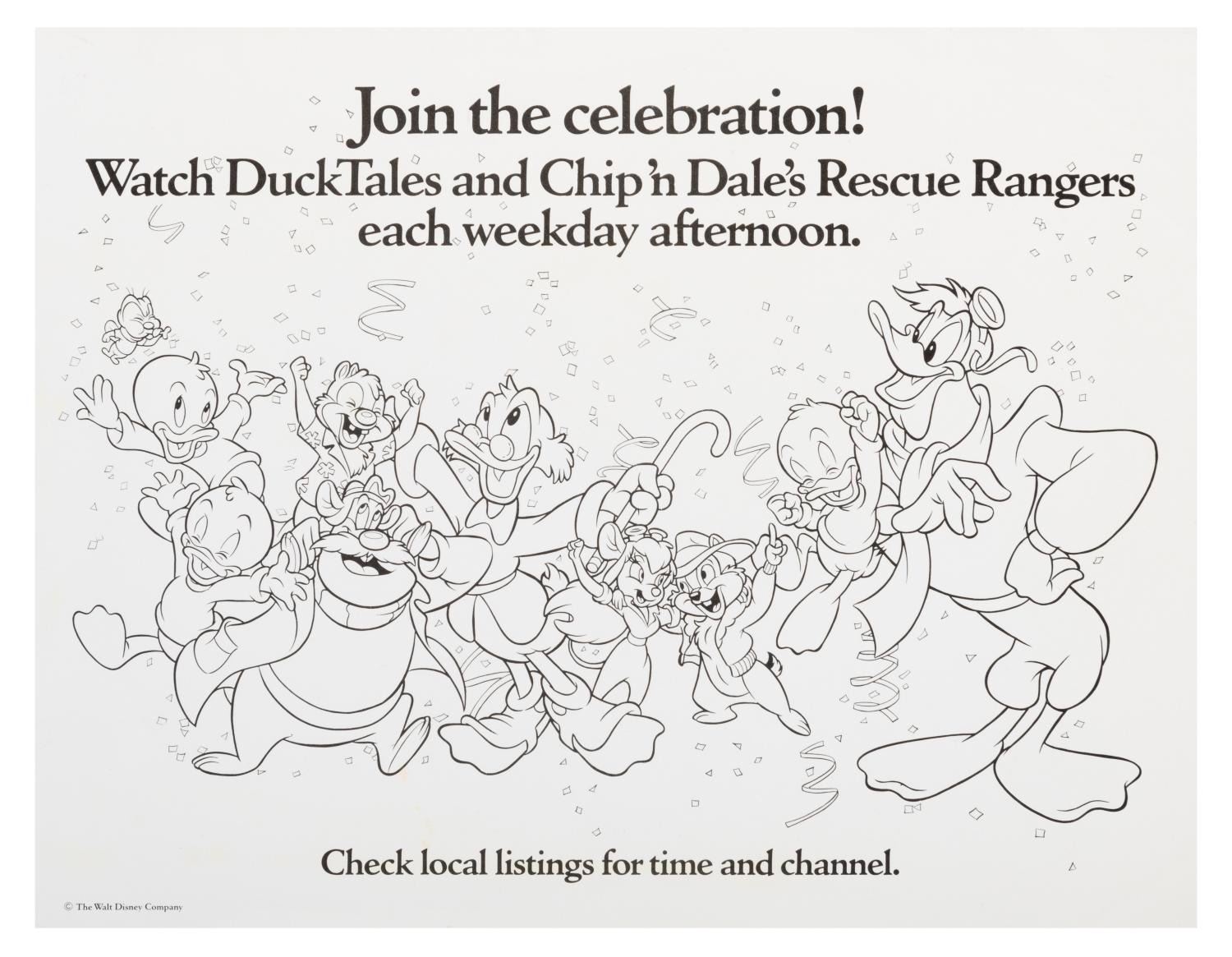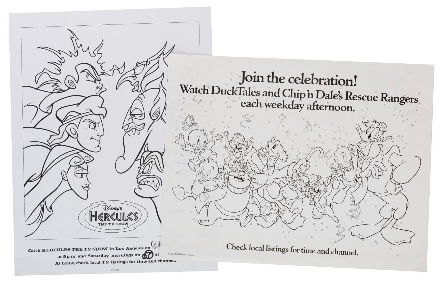 (Disney, 1990s) A pair of flyers for Disney Afternoon cartoon programs Hercules, Duck Tales, Goof Troop and Rescue Rangers. Measuring 8.5" x 11" the flyers are in very good condition with light creasing, edge wear and discoloration.
