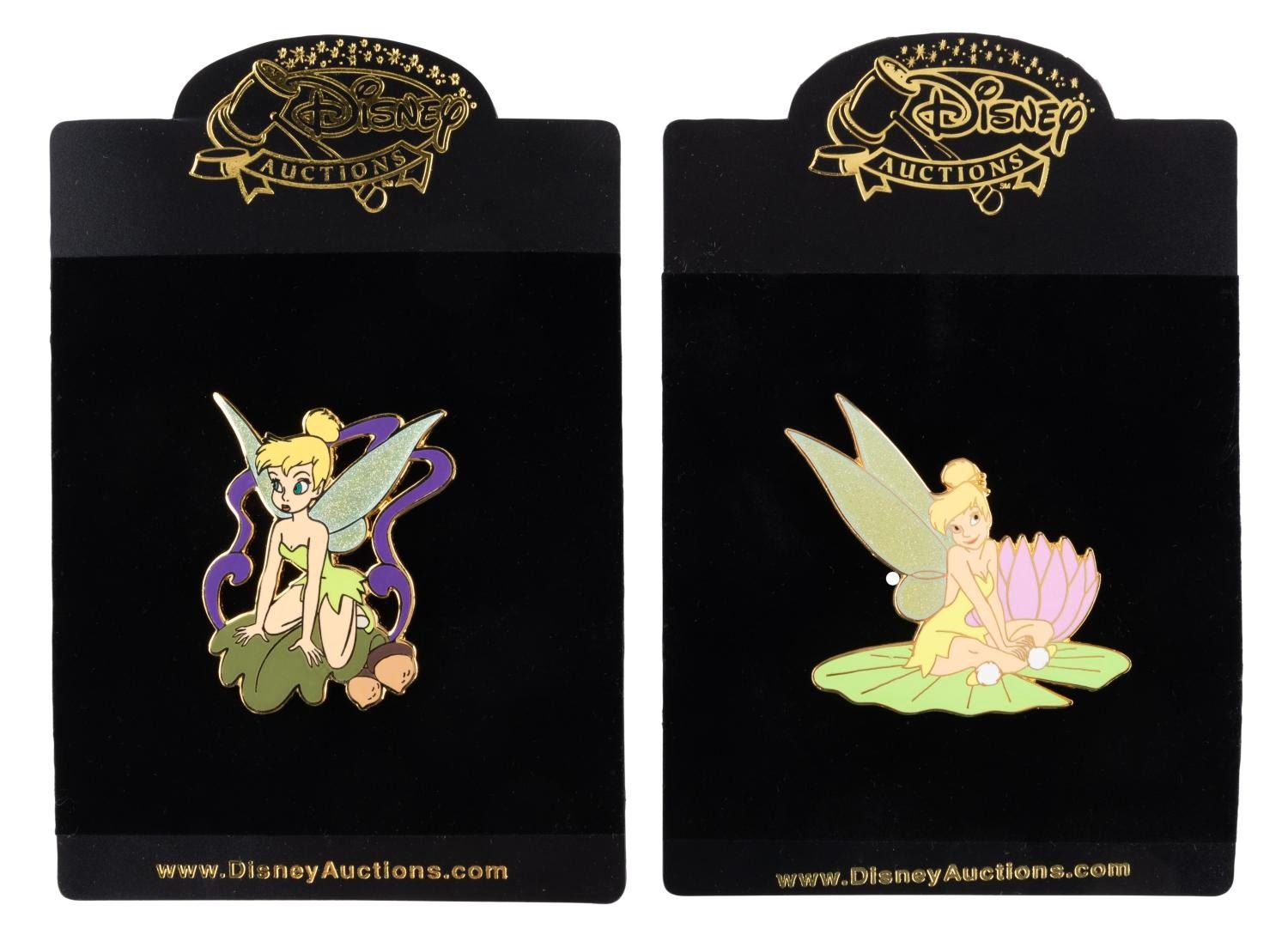 (Disney, 2004) A pair of Disney Auctions Tinker Bell pins including Tinker Bell on a Lily Pad released in a limited edition of 1000 and Tinker Bell kneeling on a leaf released in an edition of 250. The pins are in very good unused condition and come on their original cards.
