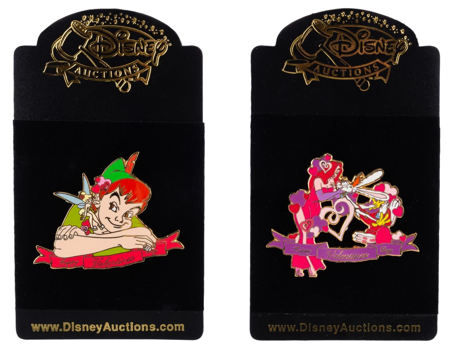 (Disney, 2004) A pair of Disney Auctions Happy Valentine’s Day pins featuring Jessica Rabbit with Roger Rabbit and Peter Pan with Tinker Bell, each released in a limited edition of 1000. The pins are in very good condition on their original cards.