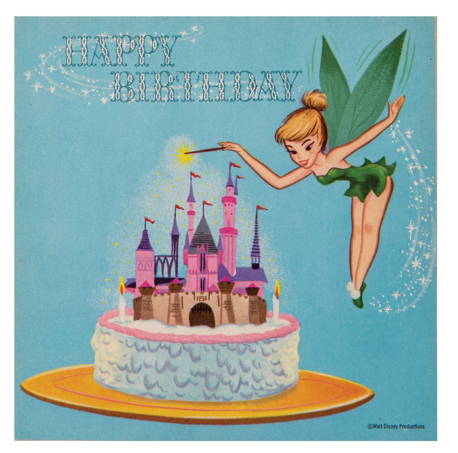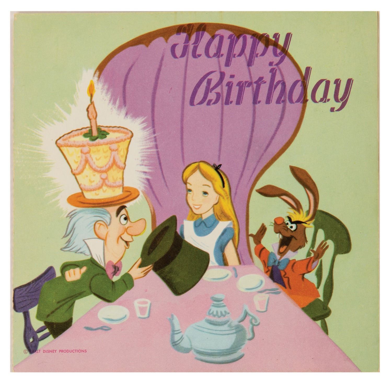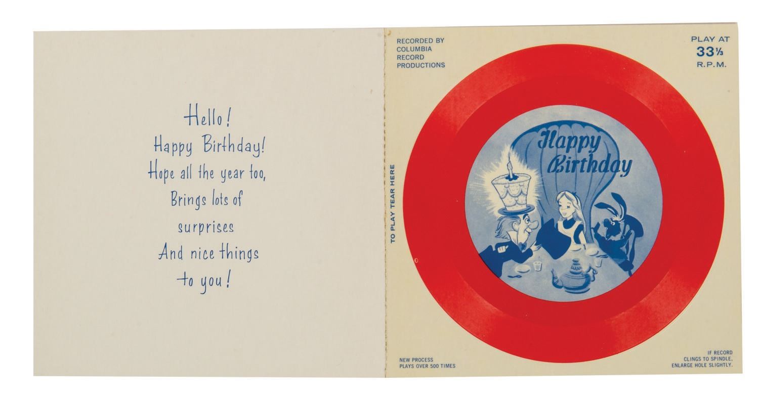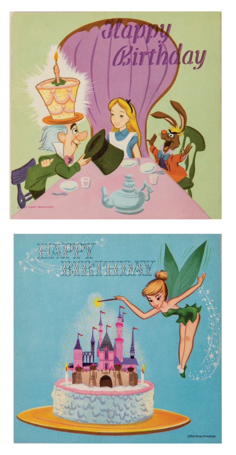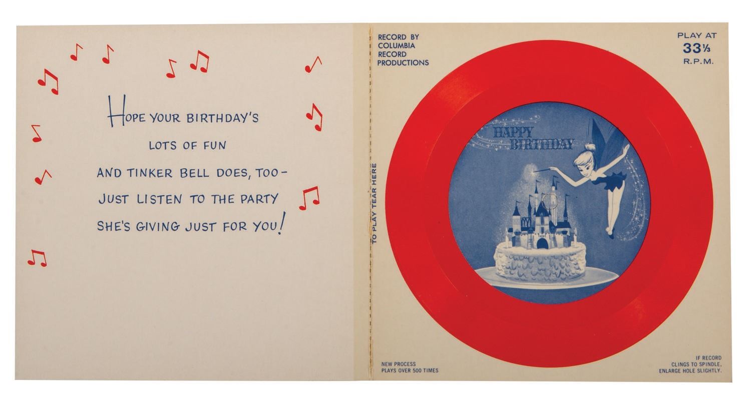 (Disney, c.1960s) A pair of Disney Birthday Record Cards. The set of cards feature recordings of authentic Disney voices of Tinker Bell, Mickey Mouse, Alice, the Mad Hatter, and more with cards manufactured by American Telecard, Inc., Buzza/Cardozo, and Columbia Record Productions. Measuring 6"x6", the cards with unpunched 33 1/3 rpm records are in very good condition, exhibiting the slightest wear to the spines