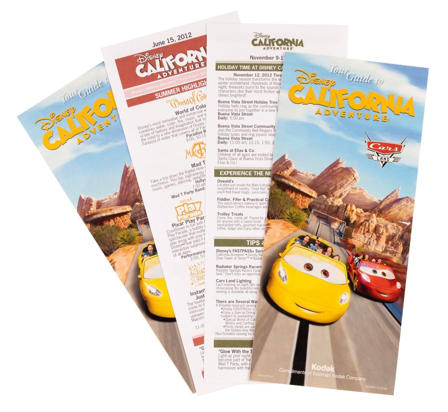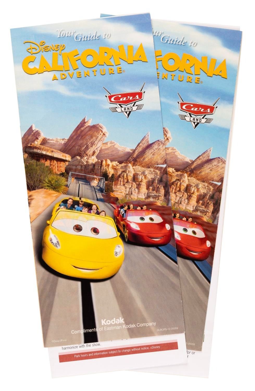 (Disney California Adventure, 2012) A pair of Disney California Adventure main gate maps and entertainment schedule brochures from June 15, 2012, the day Cars Land opened to the public, and November 9-15, 2012. Measuring 4" x 9" and 4" x 10", the brochures are in very good condition with light creases and edge wear.
