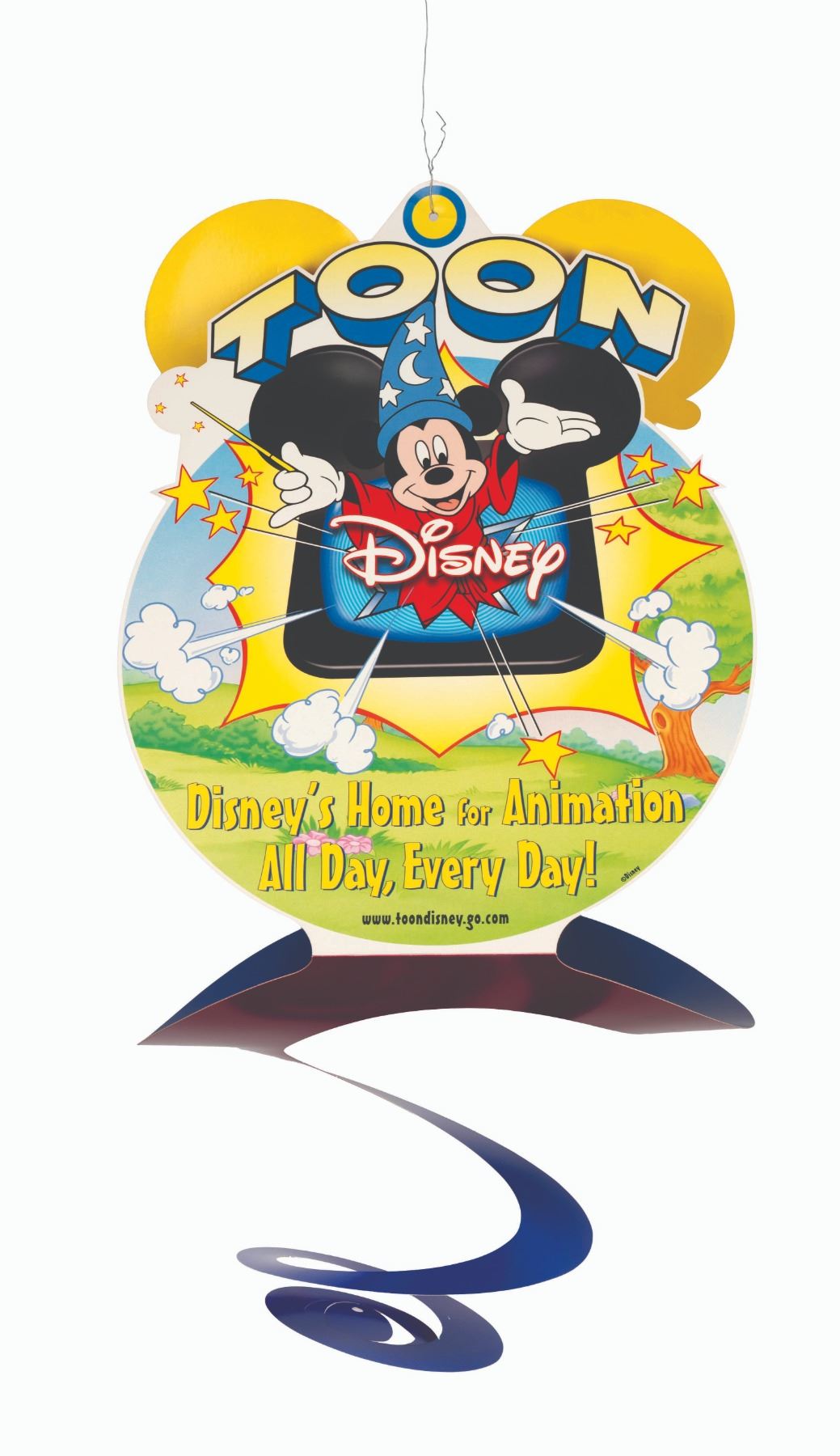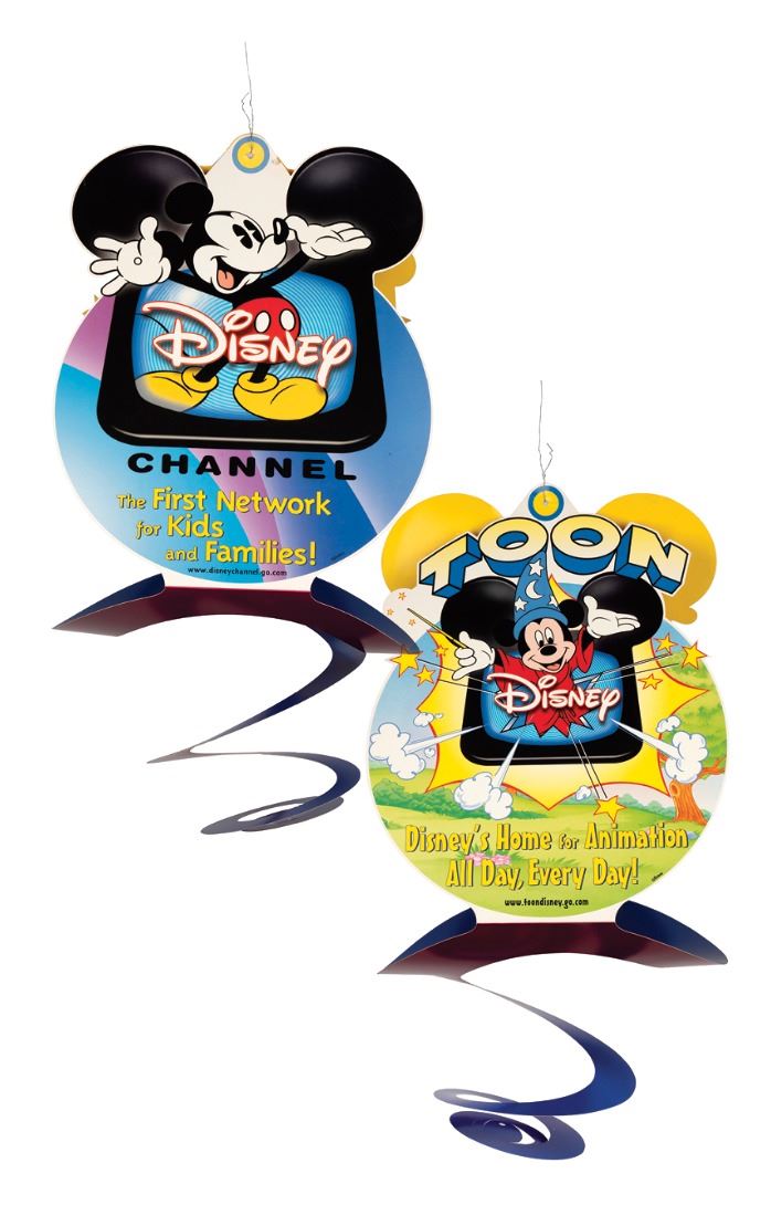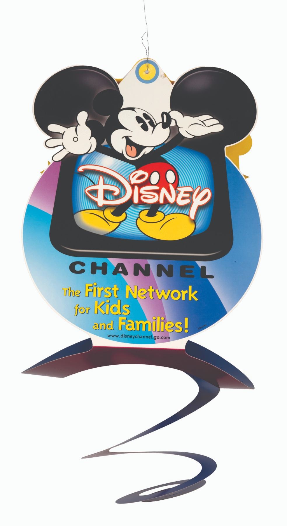 (Disney, 1990s-2000s) A pair of advertising mobiles for The Disney Channel and Toon Disney. Measuring 15.5” x 58.25” when laid flat and 16.25” x 11.5” x 30” when assembled, the thick cardstock mobiles display in very good condition with light wear to the top hang tags.