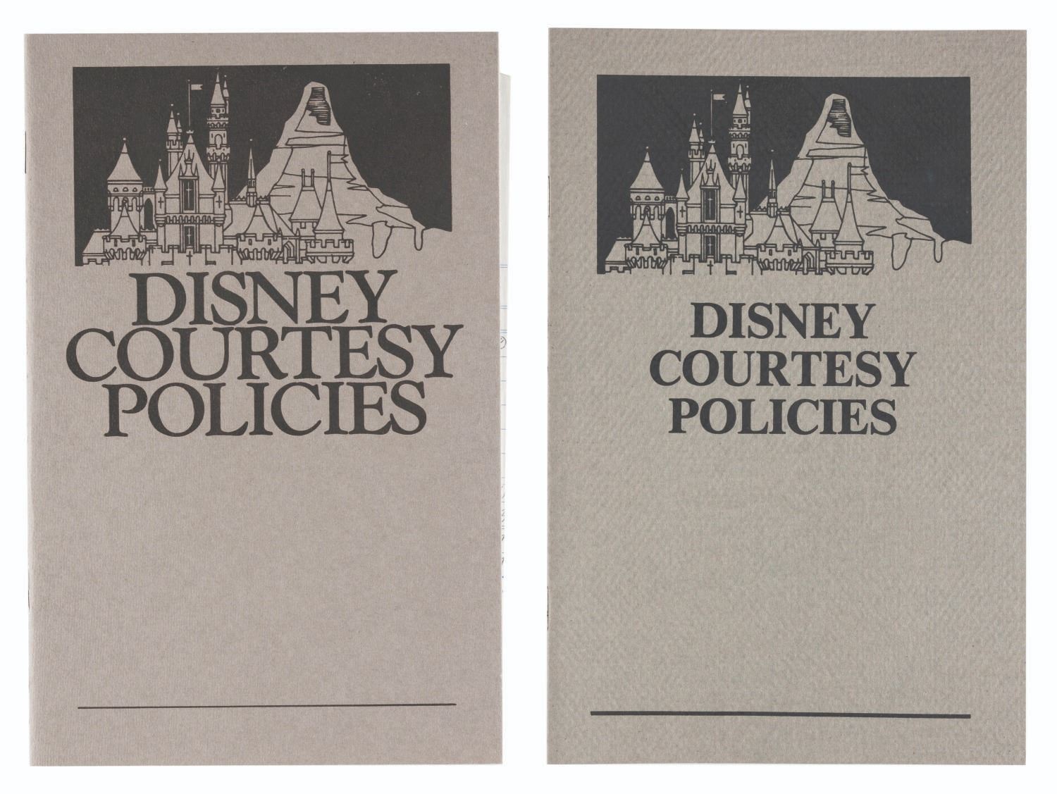 (Disneyland, 1984/89) A pair of Disney Courtesy Policies booklets outlining expectations for Cast Members working at Disneyland. Measuring 5.5" x 8.5" each, the booklets are in fine condition.