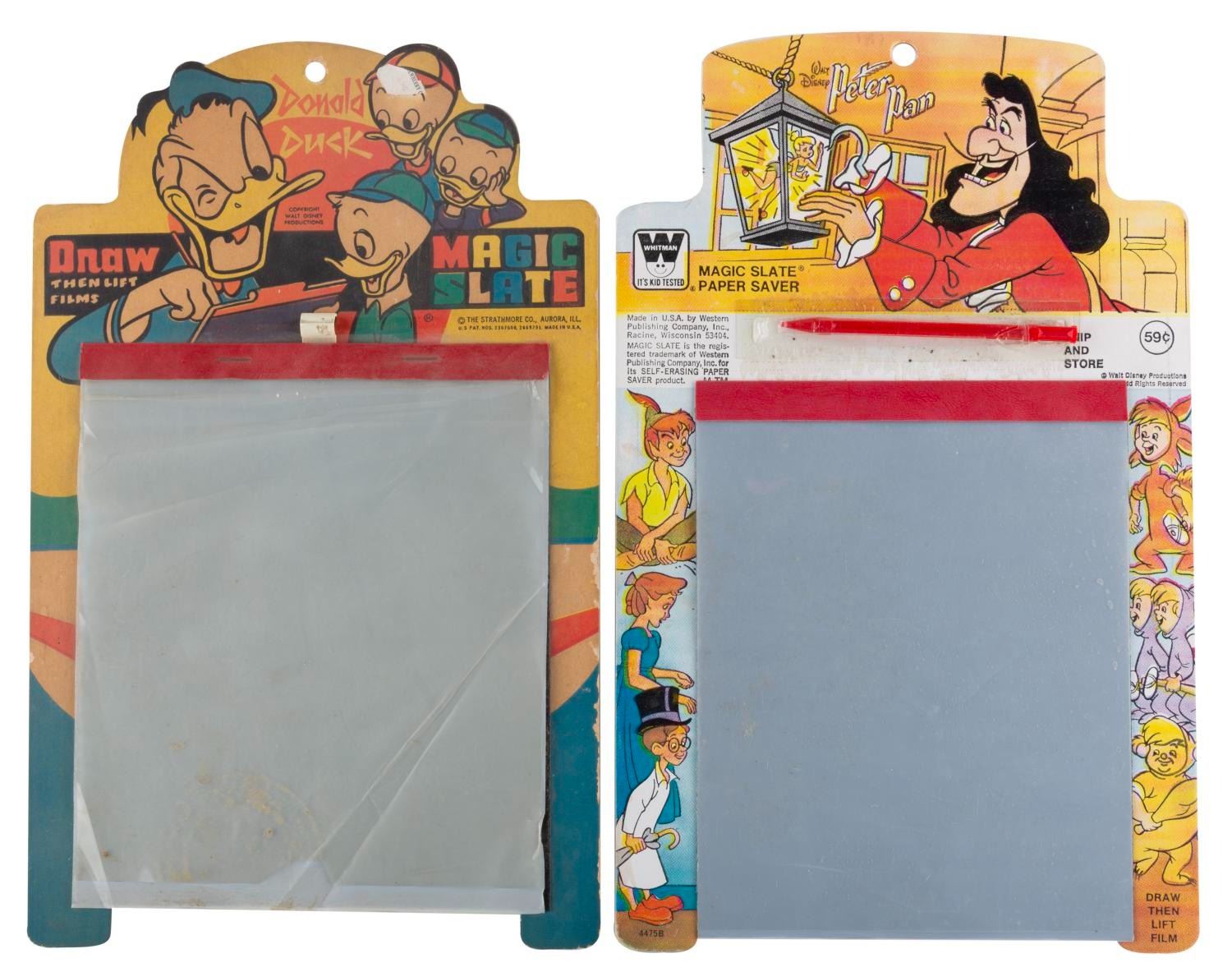 (Strathmore/Whitman, 1950s-80s) A pair of Disney magic slate toys. The Donald Duck slate dates to the 1950s, and the"Peter Pan" to the 1980s. Measuring 8.5" x 13", the Donald slate displays in good condition with discoloration from age and soiling and wear to the protective top sheet, and the Peter Pan is in very good conditin with the stylus included.