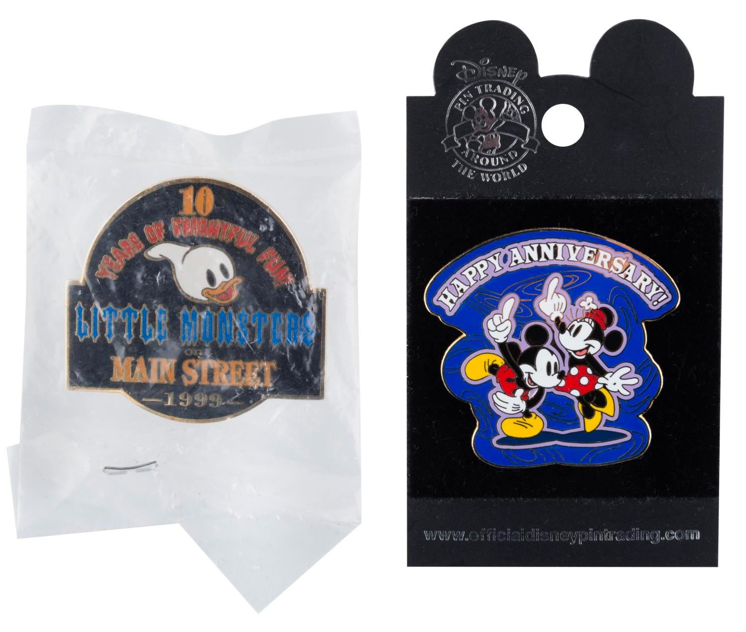 (Disney Parks, 1999/2004) A pair of Disney Parks pins, one commemorating the 10th anniversary of the “Little Monsters on Main Street” event at Disneyland, and the other from Walt Disney World with text reading “Happy Anniversary.” Measuring 1.5” x 2.75”, the pins are in fine condition, one in the original packaging.