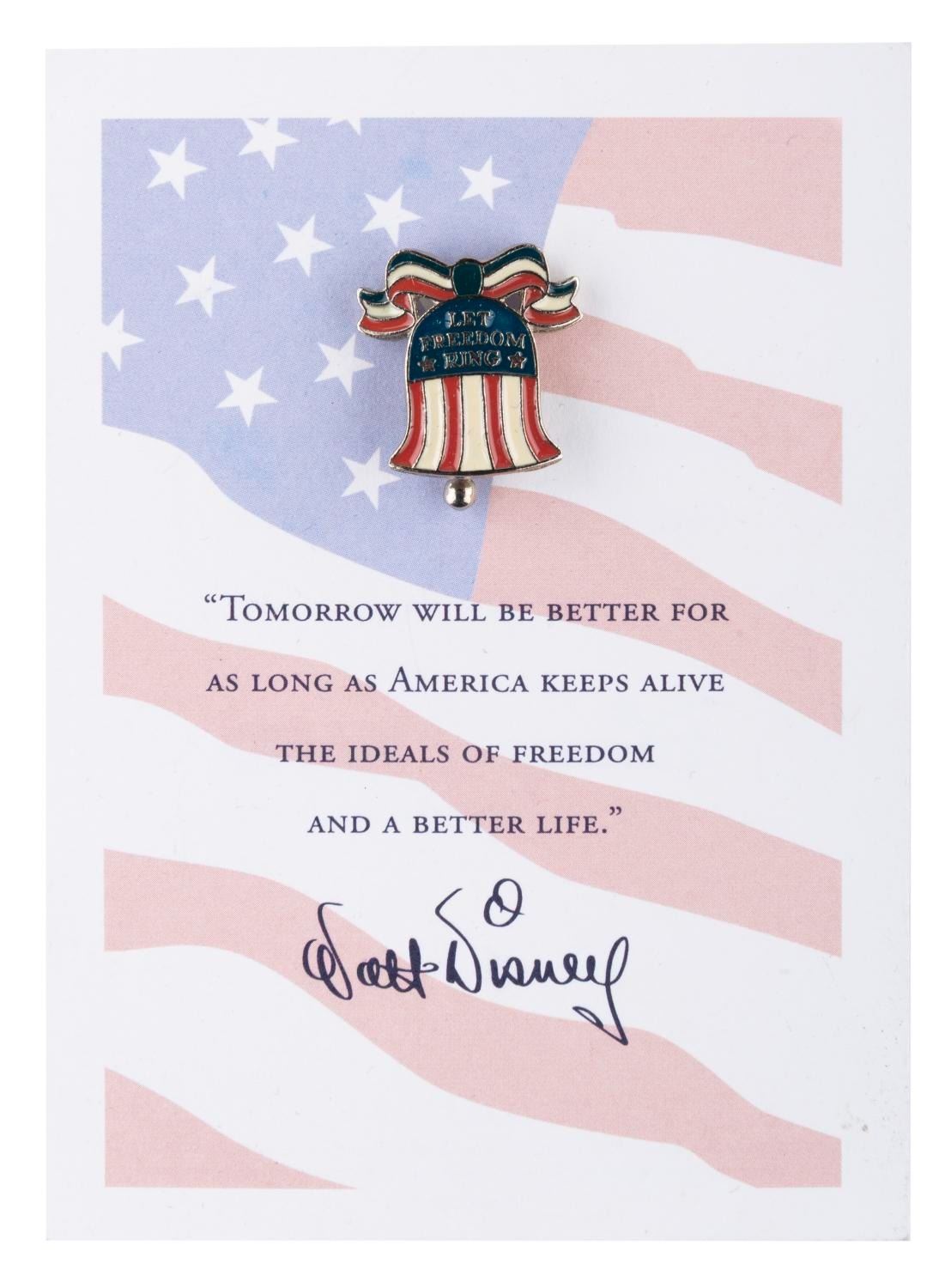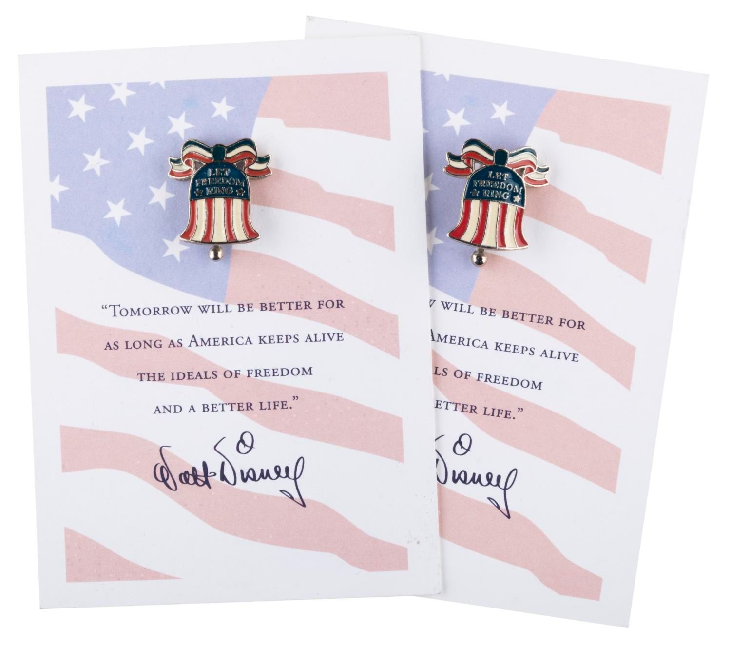 (Disney, 2001) A pair of "Let Freedom Ring" pins, given to Disney Studio employees after the September 11, 2001, attacks. The card quotes Walt Disney: "Tomorrow will be better for as long as America keeps alive the ideals of freedom and a better life." The pins and cards are in fine condition.