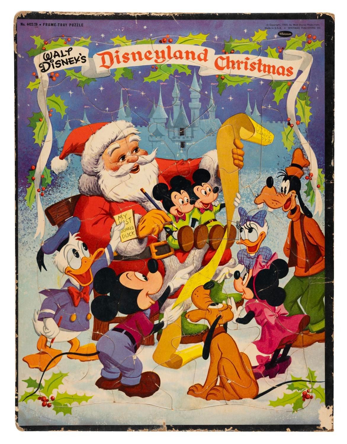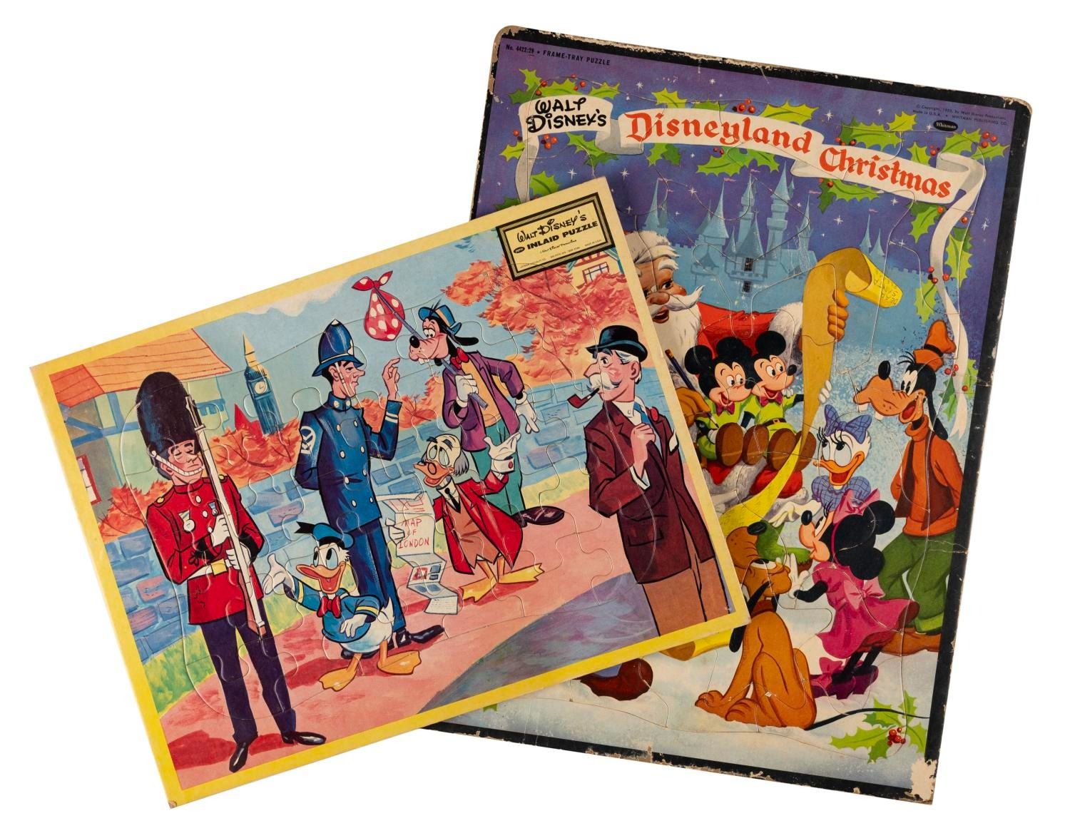 (Whitman/Jaymar, 1955-1960s) A pair of complete Disney tray puzzles. The 1955 Whitman puzzle features Mickey Mouse and friends going over their Christmas lists with Santa in Disneyland. The other puzzle by Jaymar features Donald Duck and Ludwig von Drake visiting London. Measuring 11.5" x 15", the Christmas puzzle is in good condition with edge wear and creasing from age. The London puzzle measures 9.75" x 12.75" and is in very good condition with light edge wear.