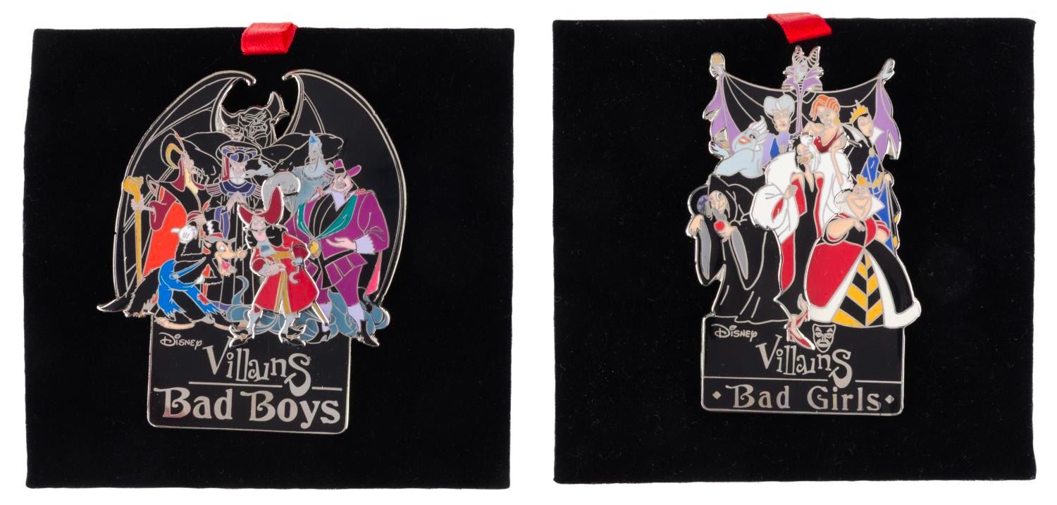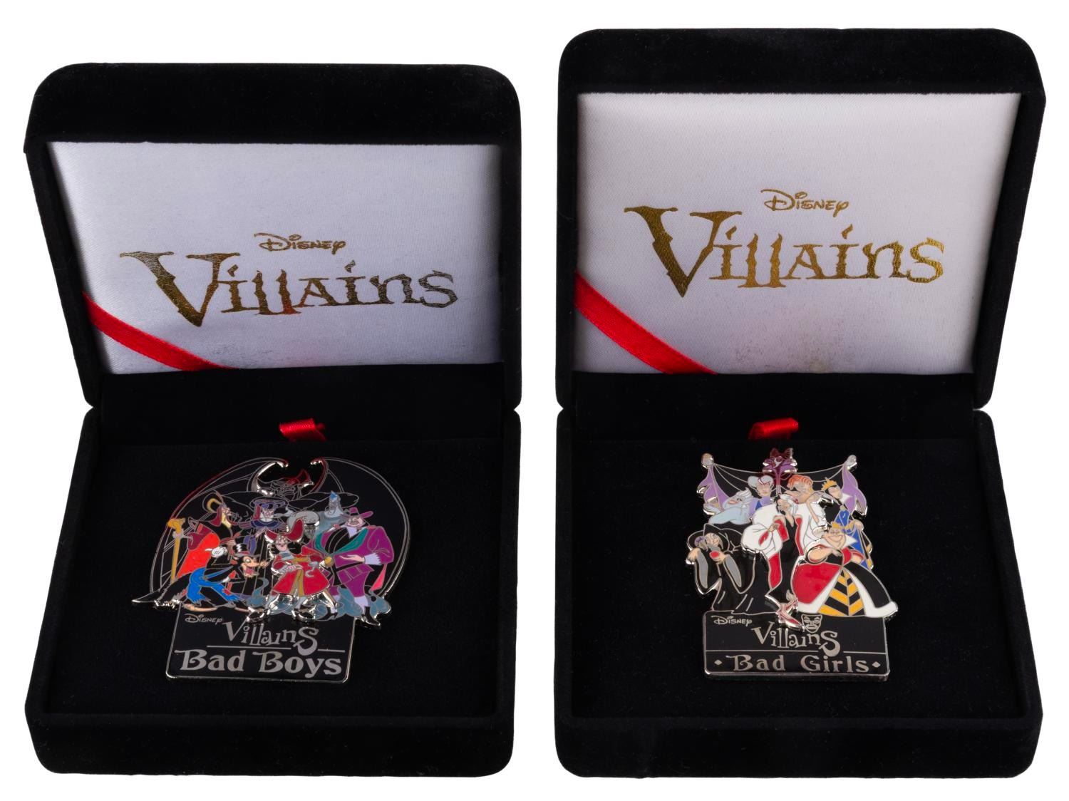 (Disneyland, 2001) A pair of Disney Villains Bad Boys and Bad Girls pins featuring many of the iconic villains in the Studio's history. The pins come with their original boxes and are in very good condition with light wear.