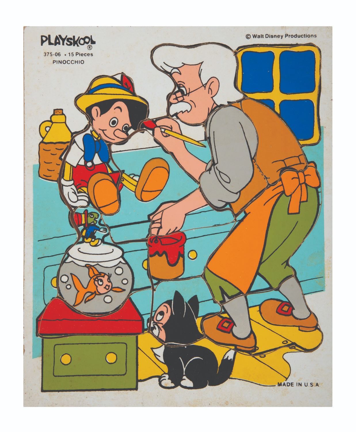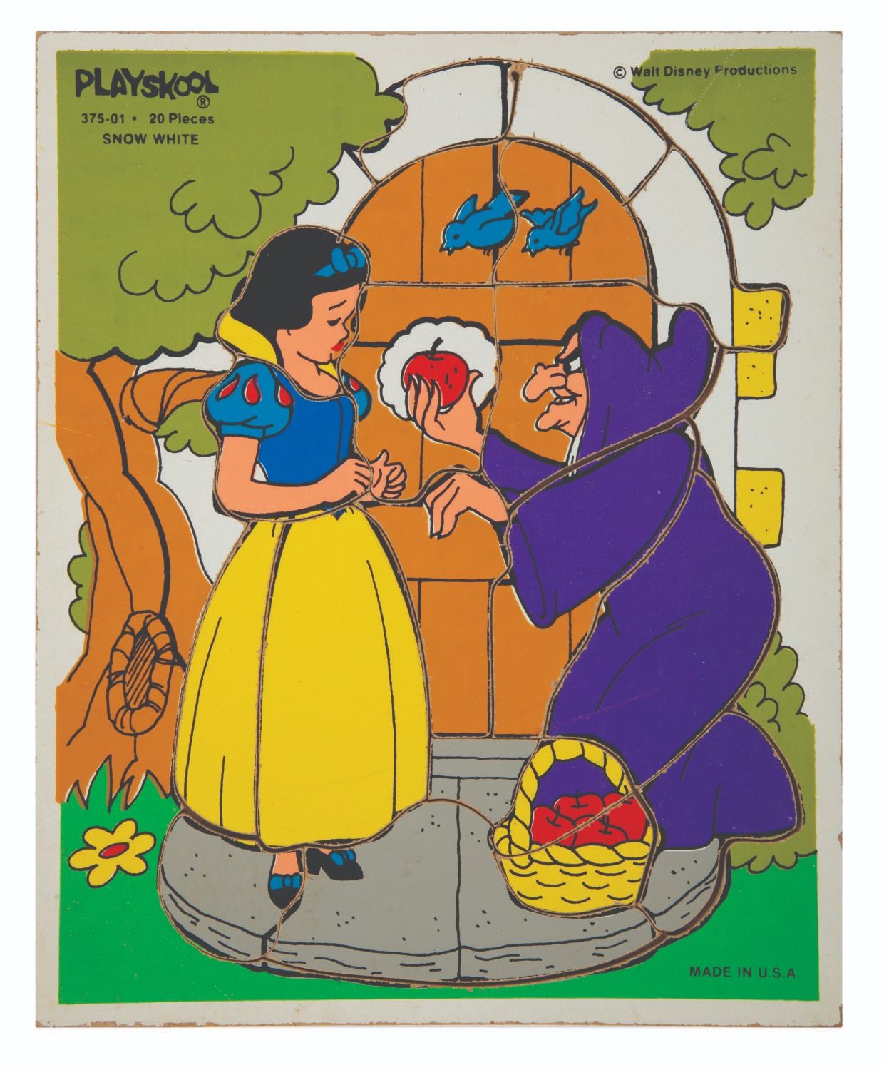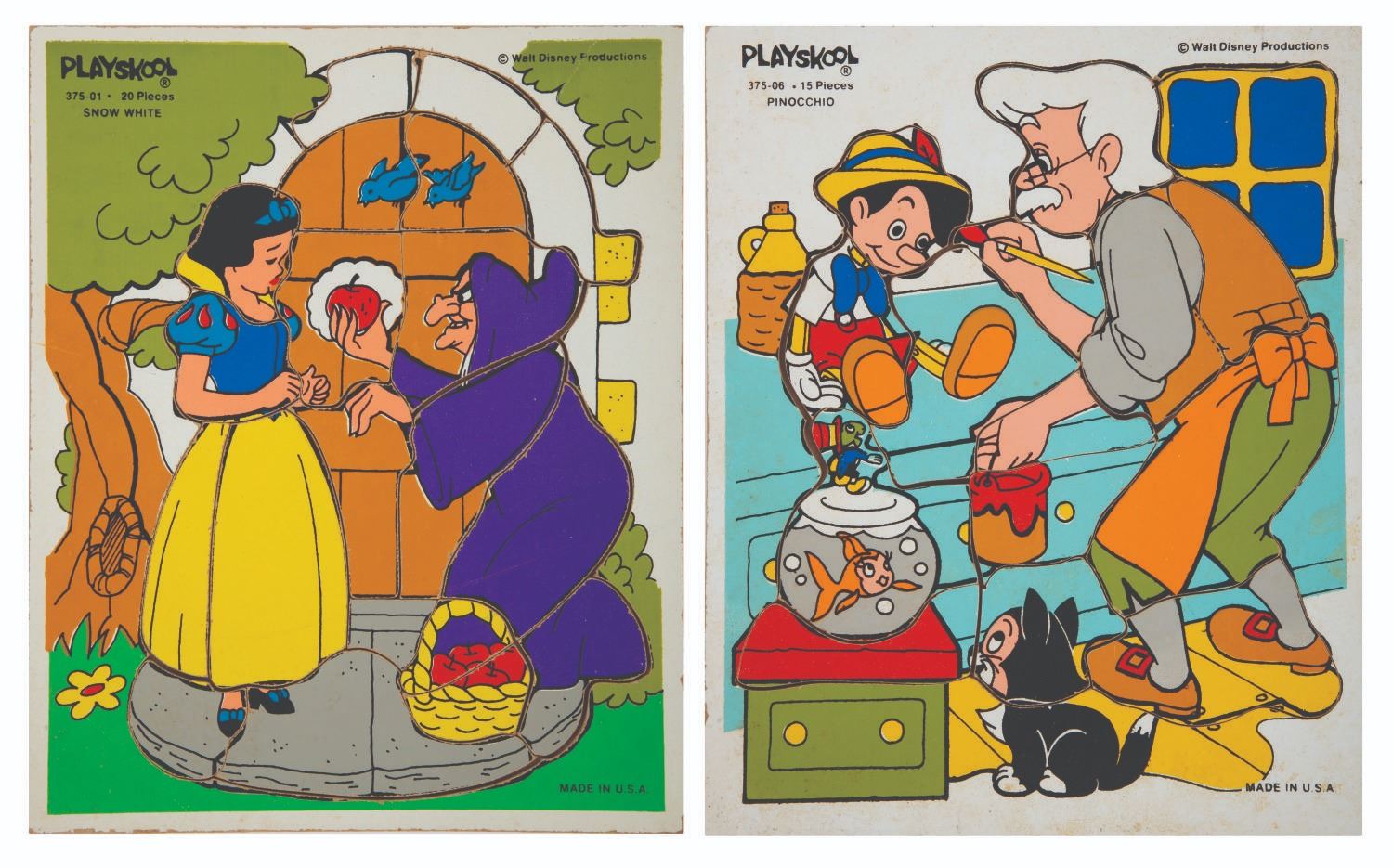 (Playskool, 1970s-80s) A pair of wooden tray puzzles with imagery inspired by Walt Disney's "Snow White and the Seven Dwarfs" and "Pinocchio." One puzzle is 15 pieces while the other is 20. Measuring 11.5" x 9.5" each, the puzzles are in very good overall condition, exhibiting minor wear.