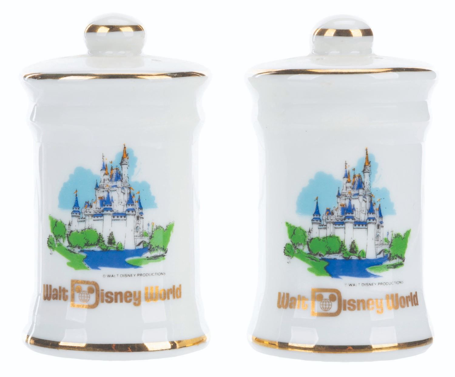 (Walt Disney World, 1980s) A pair of ceramic salt and pepper shakers featuring Cinderella Castle. Measuring 2.75” tall, the shakers are in very good condition with light wear.