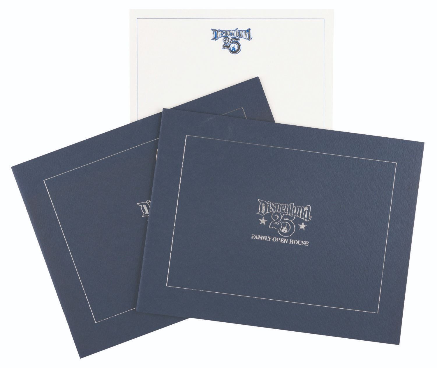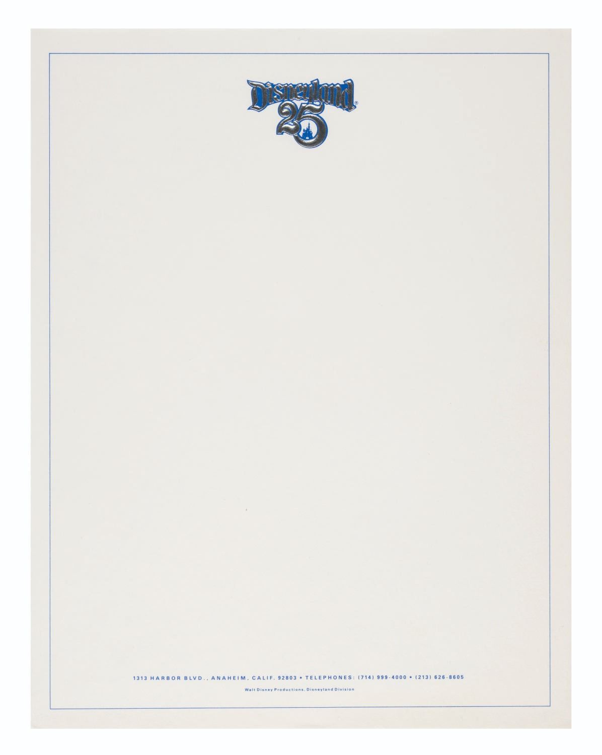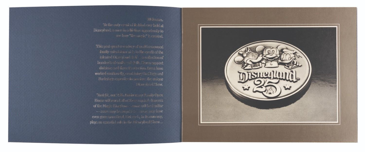 (Disneyland, 1980) A pair of booklets for the Family Open House event celebrating Disneyland’s 25th anniversary. The event was meant to offer family members a "backstage glimpse of the 'magic' behind the magic," and provided both a backstage tour and dinner for Guests. The 20-page booklet was gifted to attendees and includes rare photos and details on the event and Disneyland. Included is a page of "Disneyland 25" stationery. Measuring 8.5" x 11" each, the booklets and stationery are in fine condition.