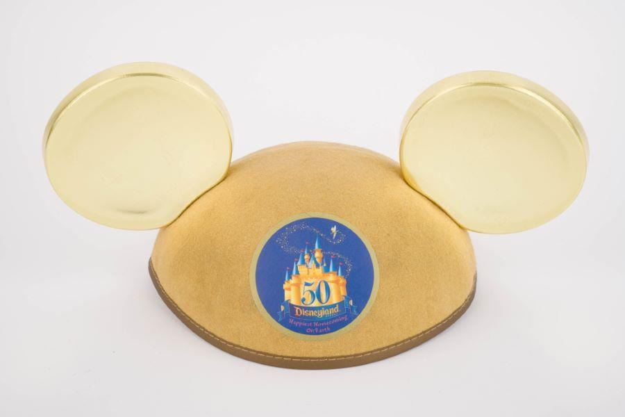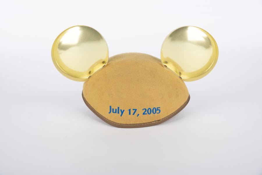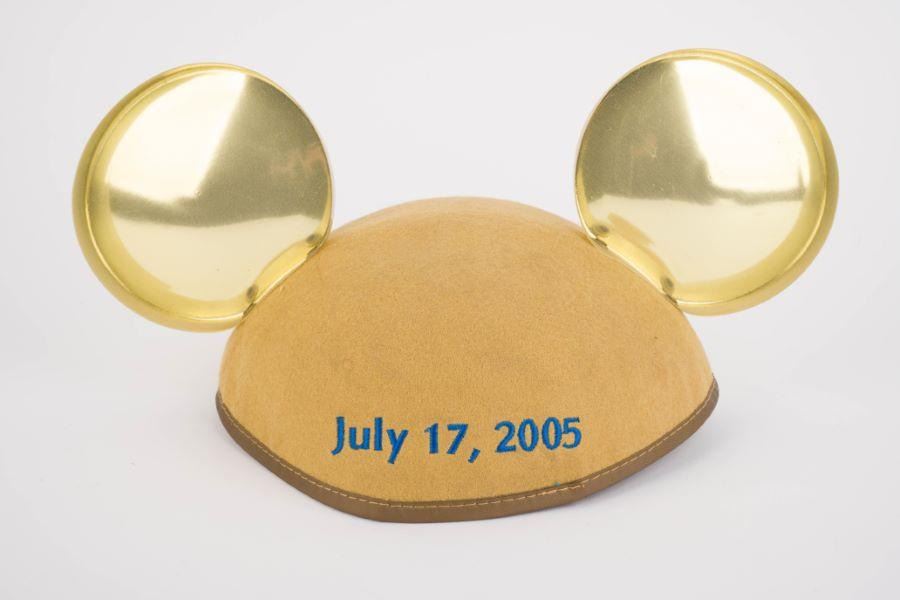 (Disneyland, 2005) A pair of gold Mickey Mouse ears commemorating Disneyland’s 50th Anniversary. The back of the brim is embroidered with the date of the 50th anniversary,"July 17, 2005." Measuring 11.25" across, 7.5" in diameter, and 6.5" tall, the ears are in very good condition with only minimal wear.