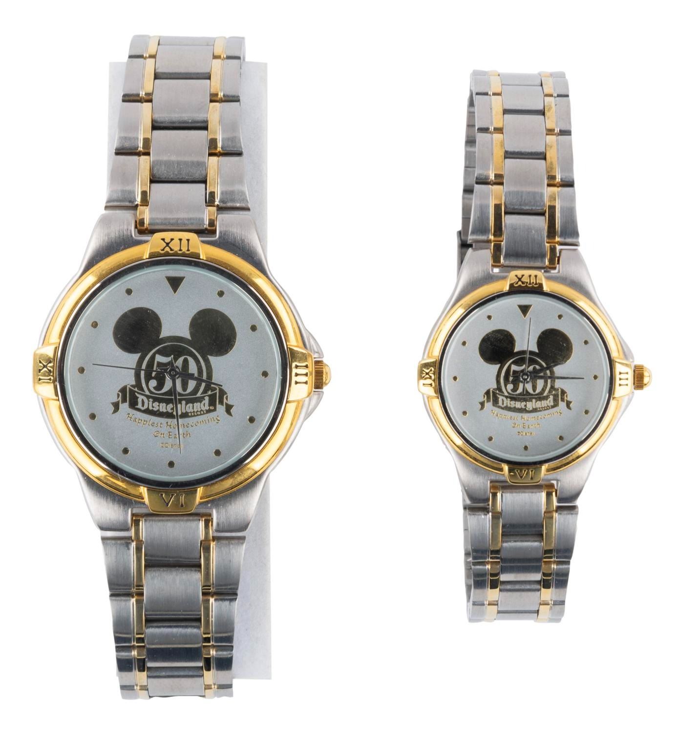 (Disneyland, 2005) A pair of his and her wristwatches commemorating Disneyland’s Happiest Homecoming on Earth celebration for the Park’s 50th anniversary. The quartz and stainless steel watches are in very good condition with light scratches.
