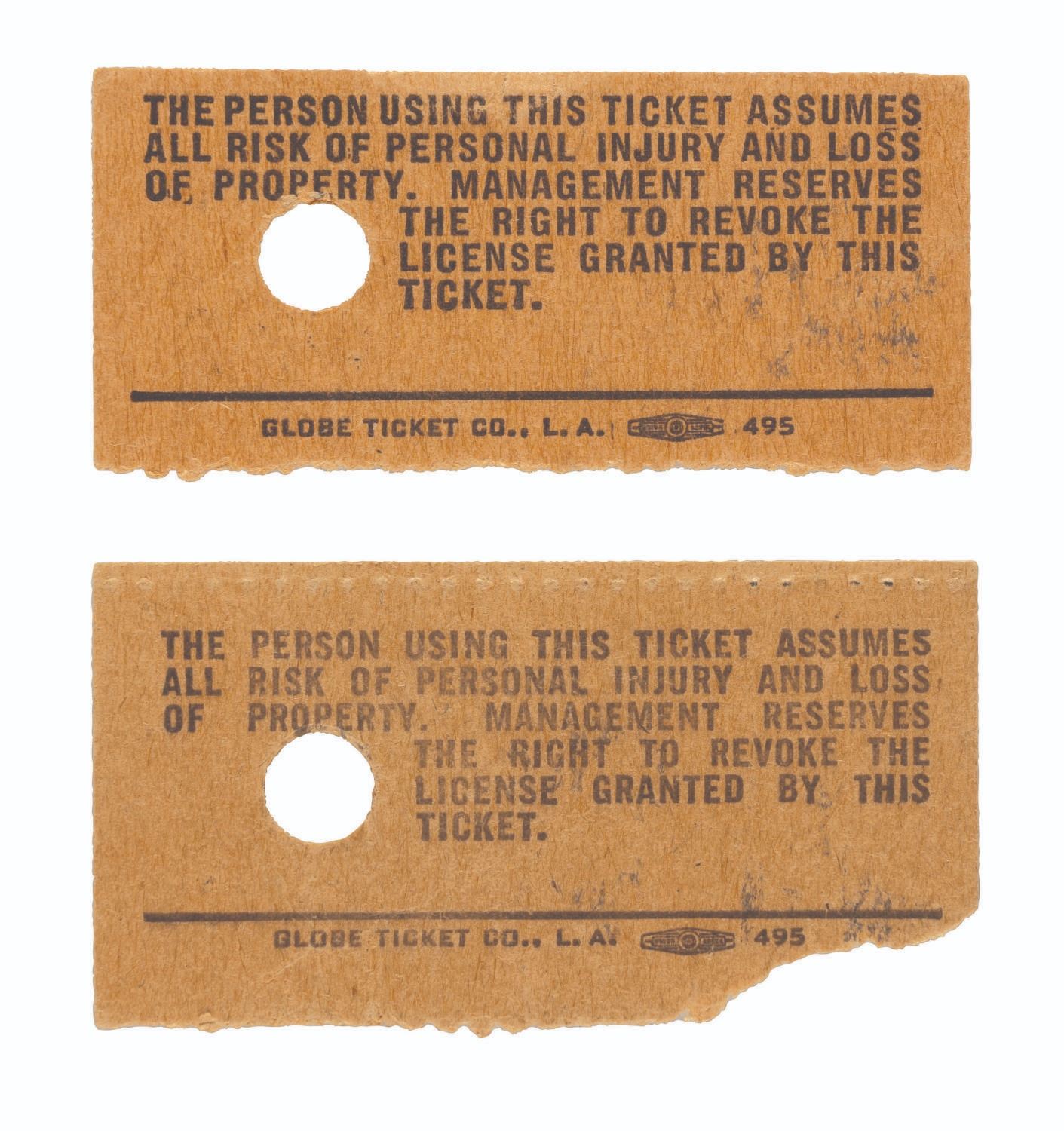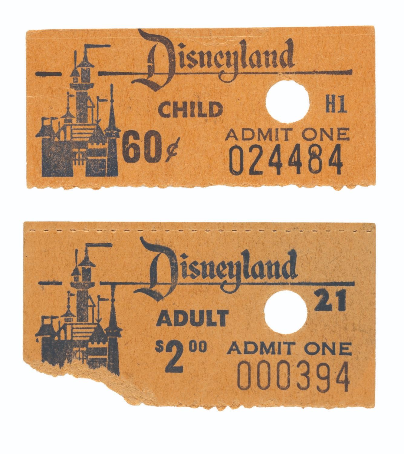 (Disneyland, 1960s) A pair of Disneyland admission tickets, one a $2 Adult ticket and the other a 60-cent Child ticket. Measuring 1" x 2" each, the child ticket is in good condition with light edge wear, creasing, and light discoloration from age. The adult ticket is in fair condition with a 0.5" tear to the lower left corner.