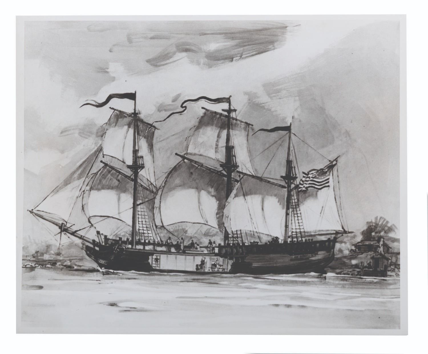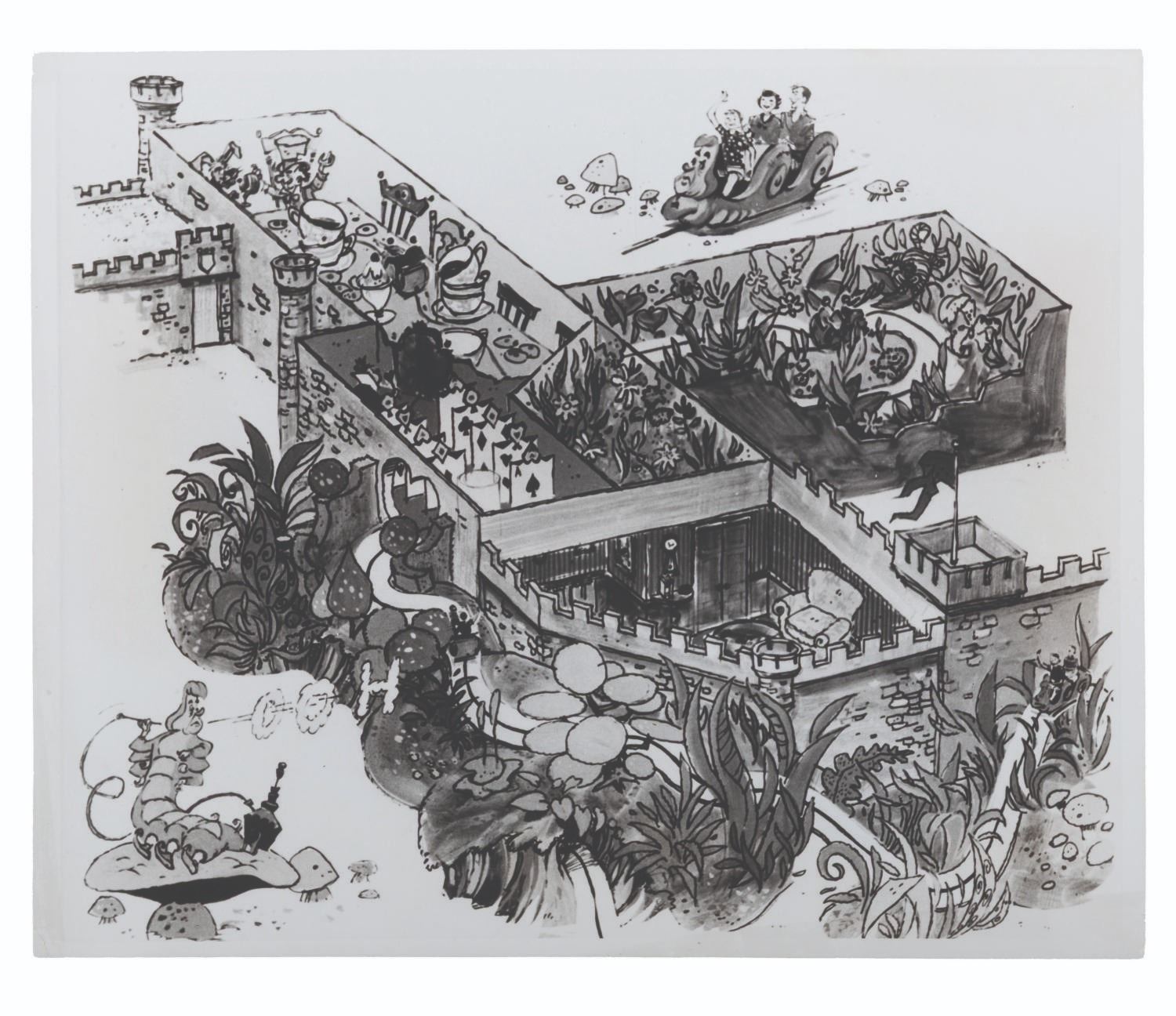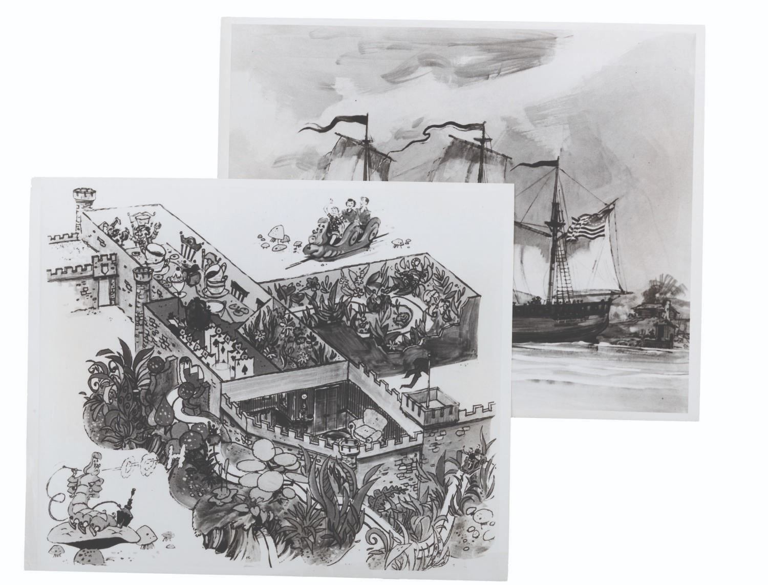 (Disneyland, 1958) A pair of Disneyland Attraction concept art publicity photos. Included are the Sailing Ship Columbia and the interior of Alice in Wonderland, each with a slip of typed information taped to the reverse. Measuring 8” x 10”, the photos are in good to very good condition with light edge wear and creasing and discoloration to the tape on the reverse.