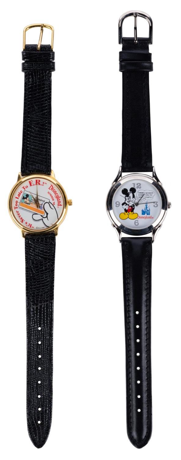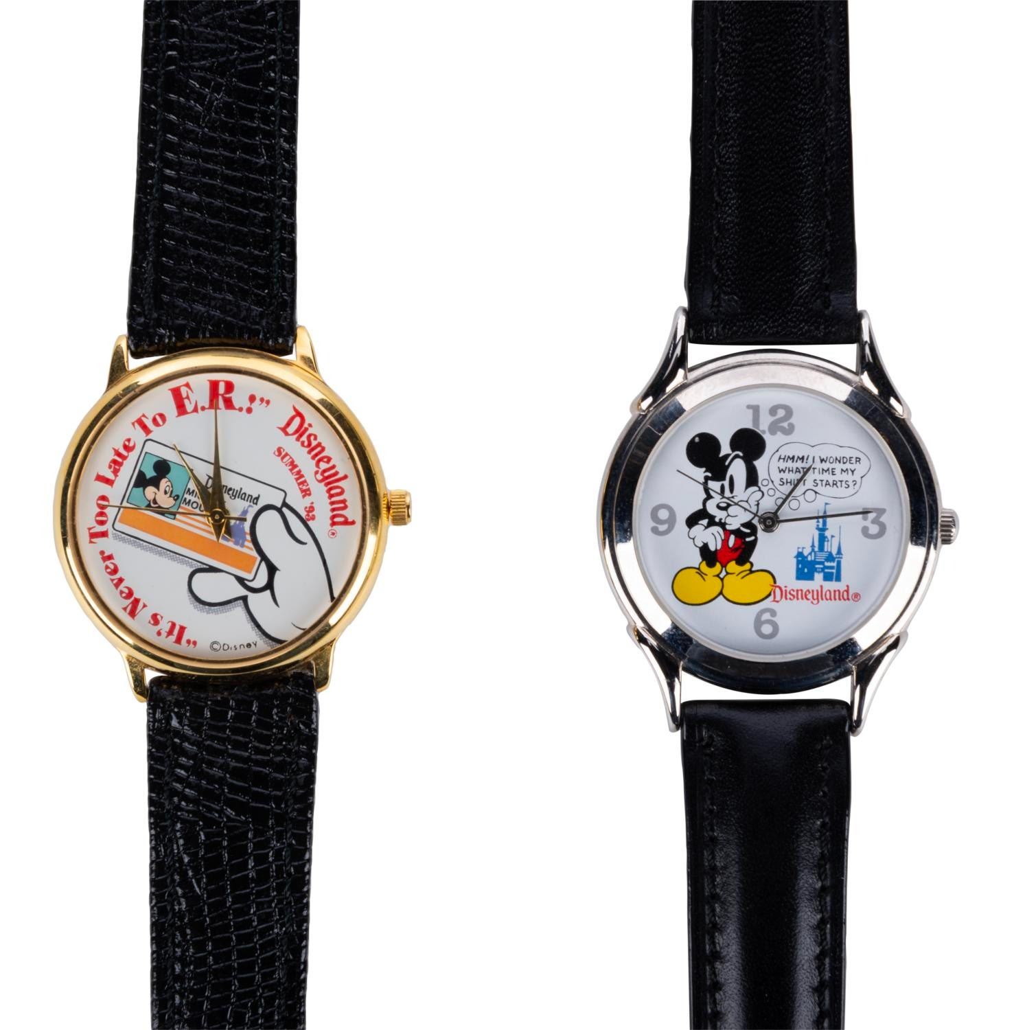 (Disneyland, 1990s) A Pair of very rare Disneyland Cast Member Watches. Among this set are an "It's Never Too Late To E.R." by Becora and "I Wonder What Time My Shift Starts" by Ballanda numbered "295/500". Measuring 1.25" in diameter, each timepiece is in very good condition with few faint scuffs from handling.
