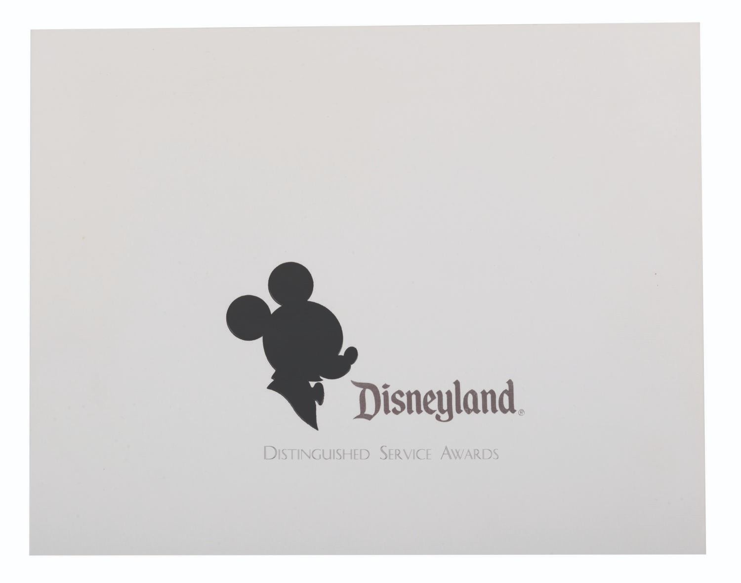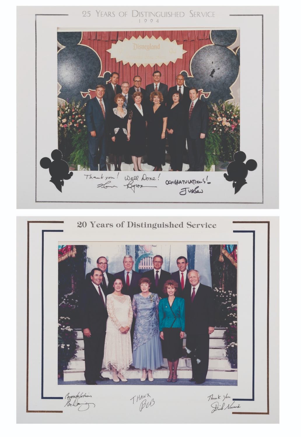 (Disneyland, 1990s) A pair of photographs from the Disneyland Distinguished Service Awards featuring the honorees who served for 20 and 25-year periods. The photos’ protective folders are signed by Dick Nunis, Ron Dominguez, Judson Green, Byron Pollitt, and two additional signees. Measuring 8” x 10” each in their 11” x 14” protective folders, the photos are in good to very good condition with scrapes on the 20-year photo, with light stains and wear on the folders.