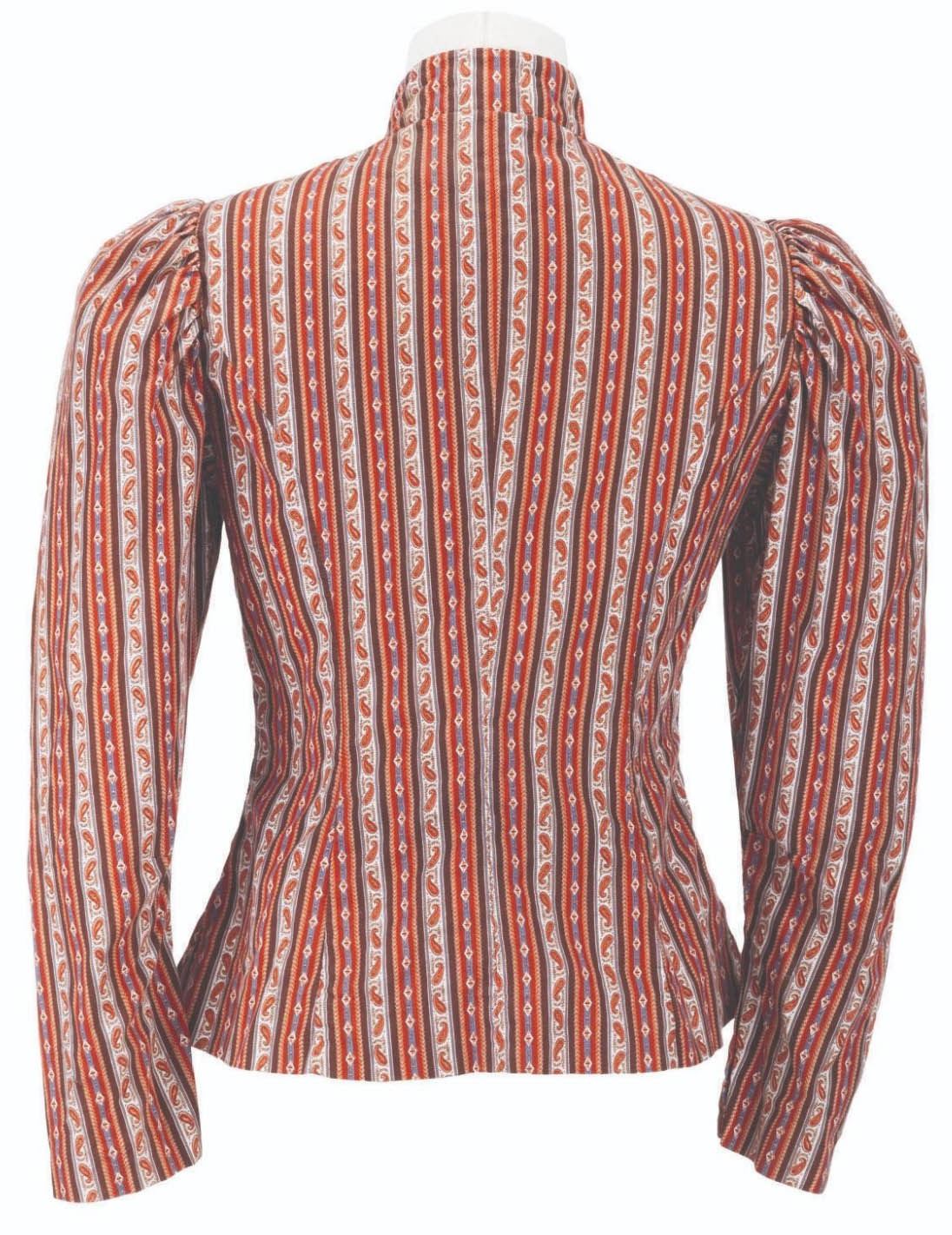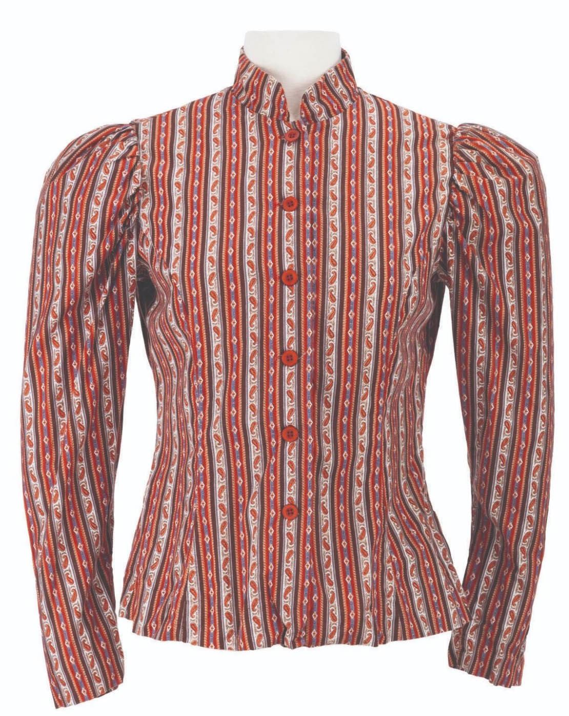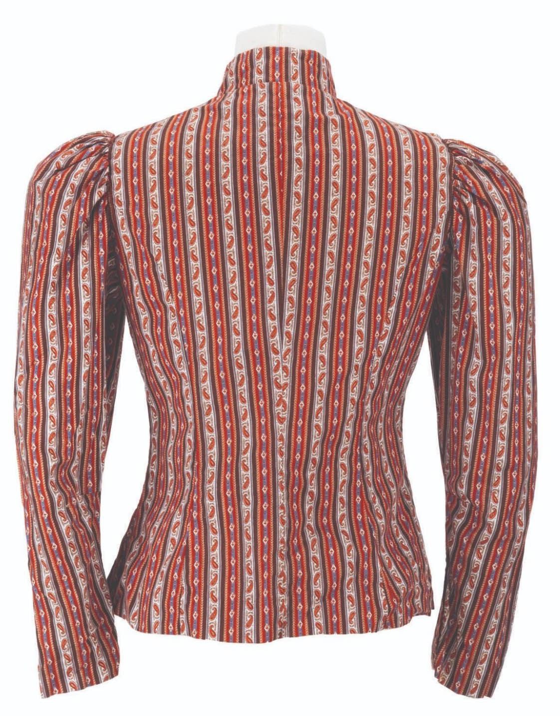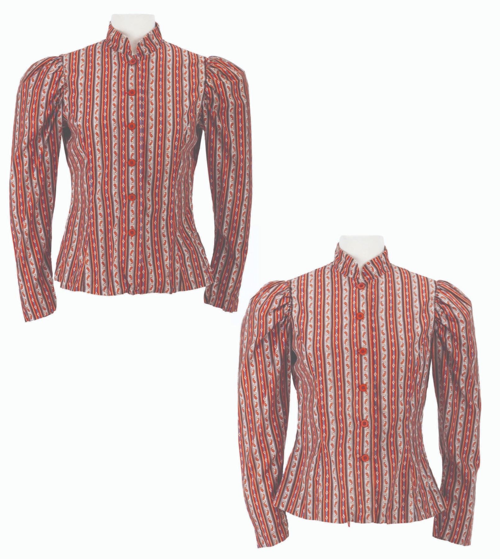 (Disneyland, 1970s-90s) A pair of female Cast Member costumes with puffy shoulders, vertical stripes, and a swirl pattern. Labeled a size 14 each, the two shirts are in very good condition with light wear from Park use.