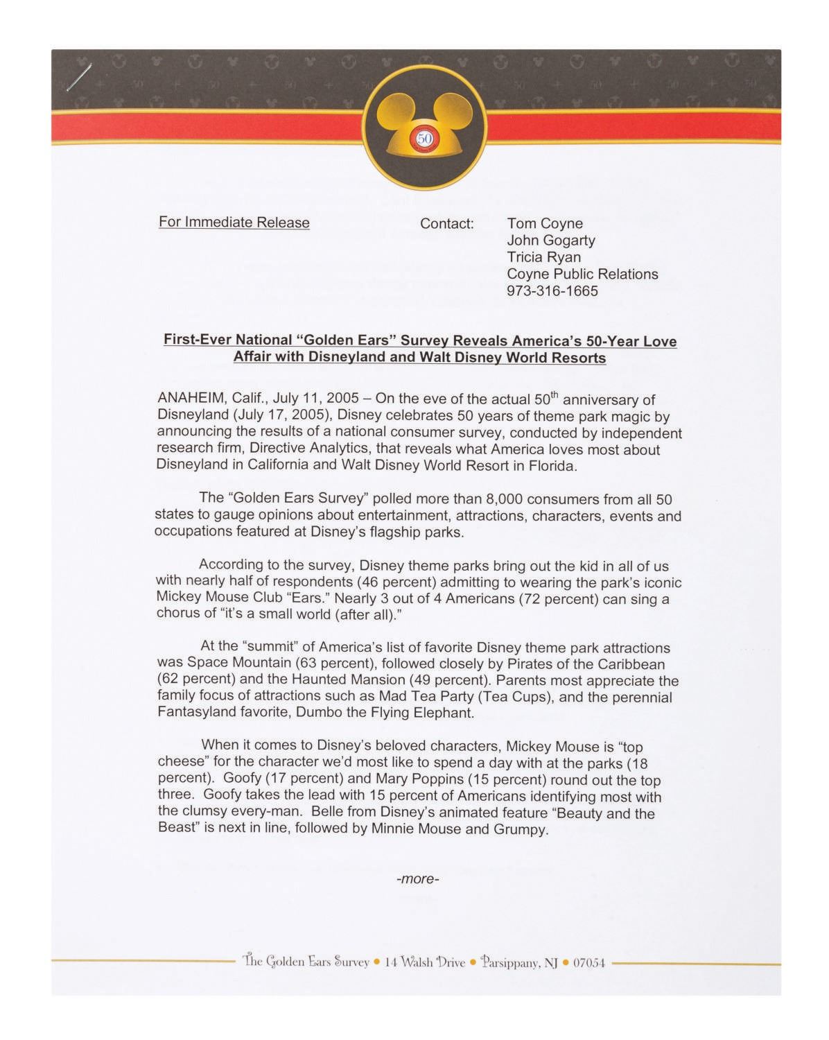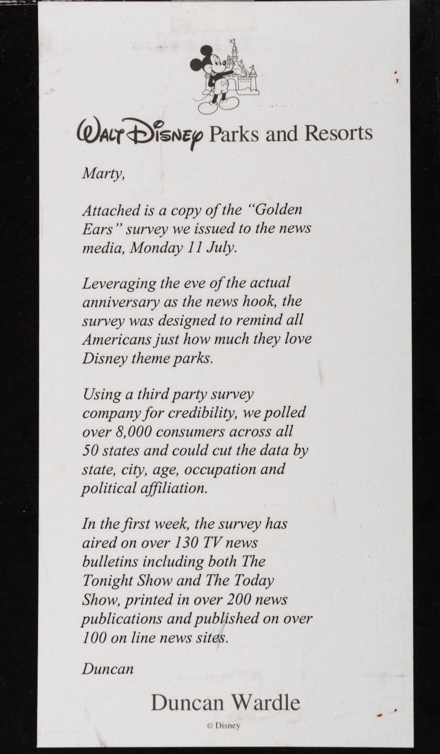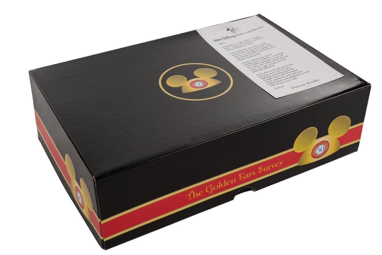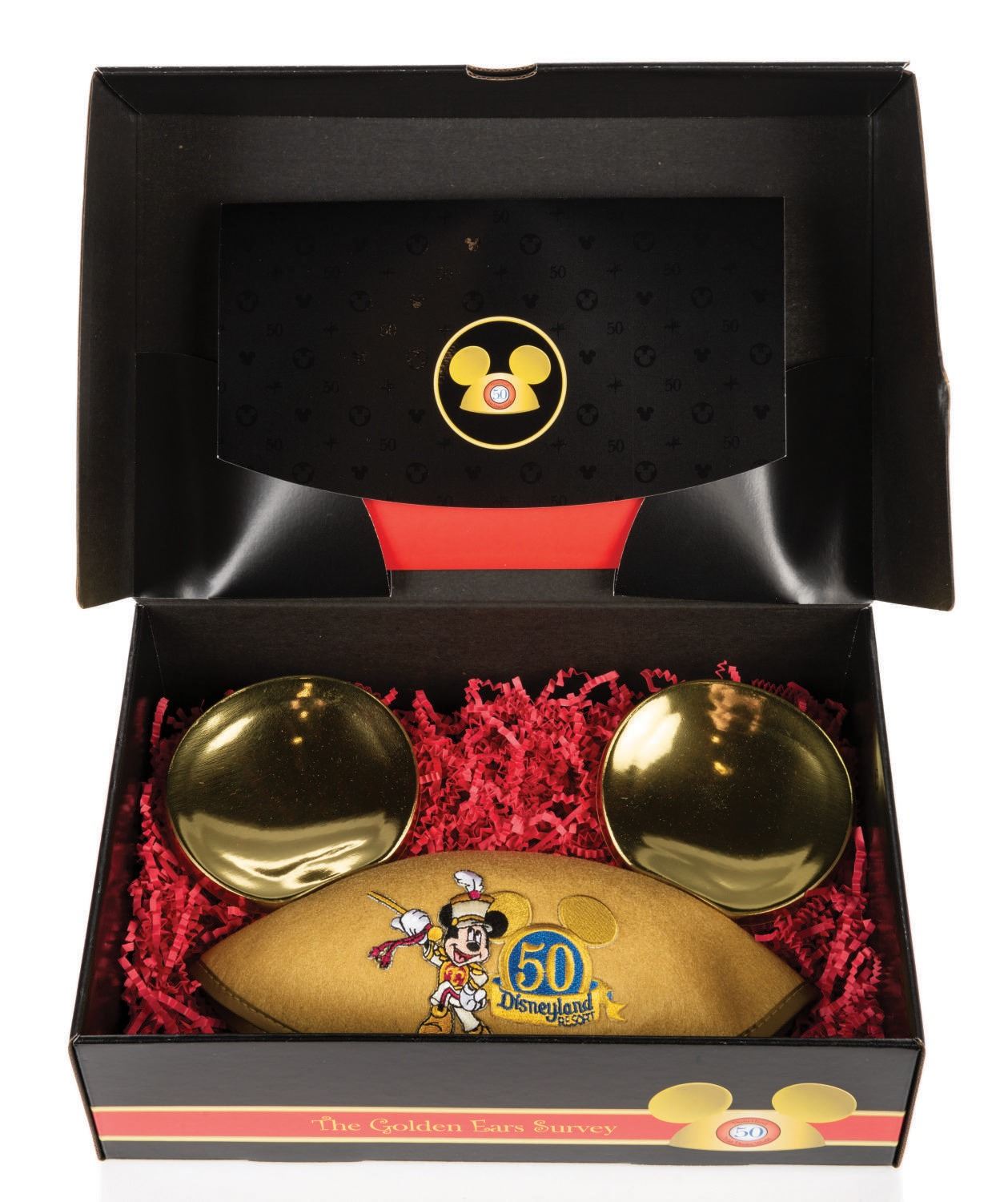 (Disneyland, 2005) A Golden Ears Hat produced in honor of the 50th anniversary of Disneyland Resort. The Mickey Ear Hat comes complete in box with "Golden Ears Survey" results in commemorative envelope. Measuring size large, the ear hat is in fine condition and comes within original 8.25"x12" and 3.5" deep very good condition box which exhibits minor creases and dents.