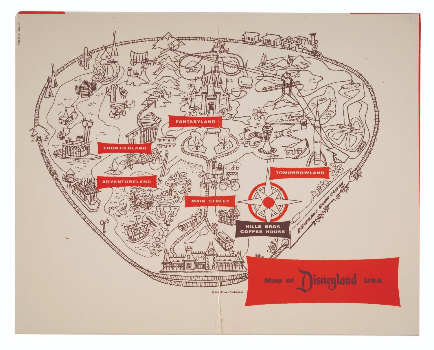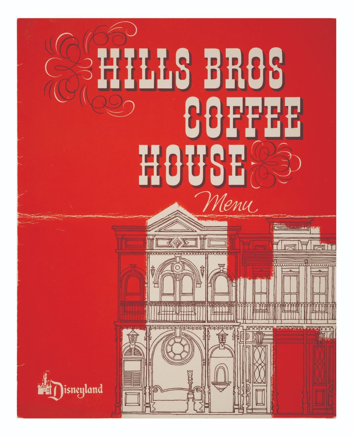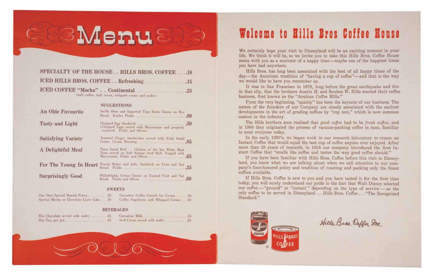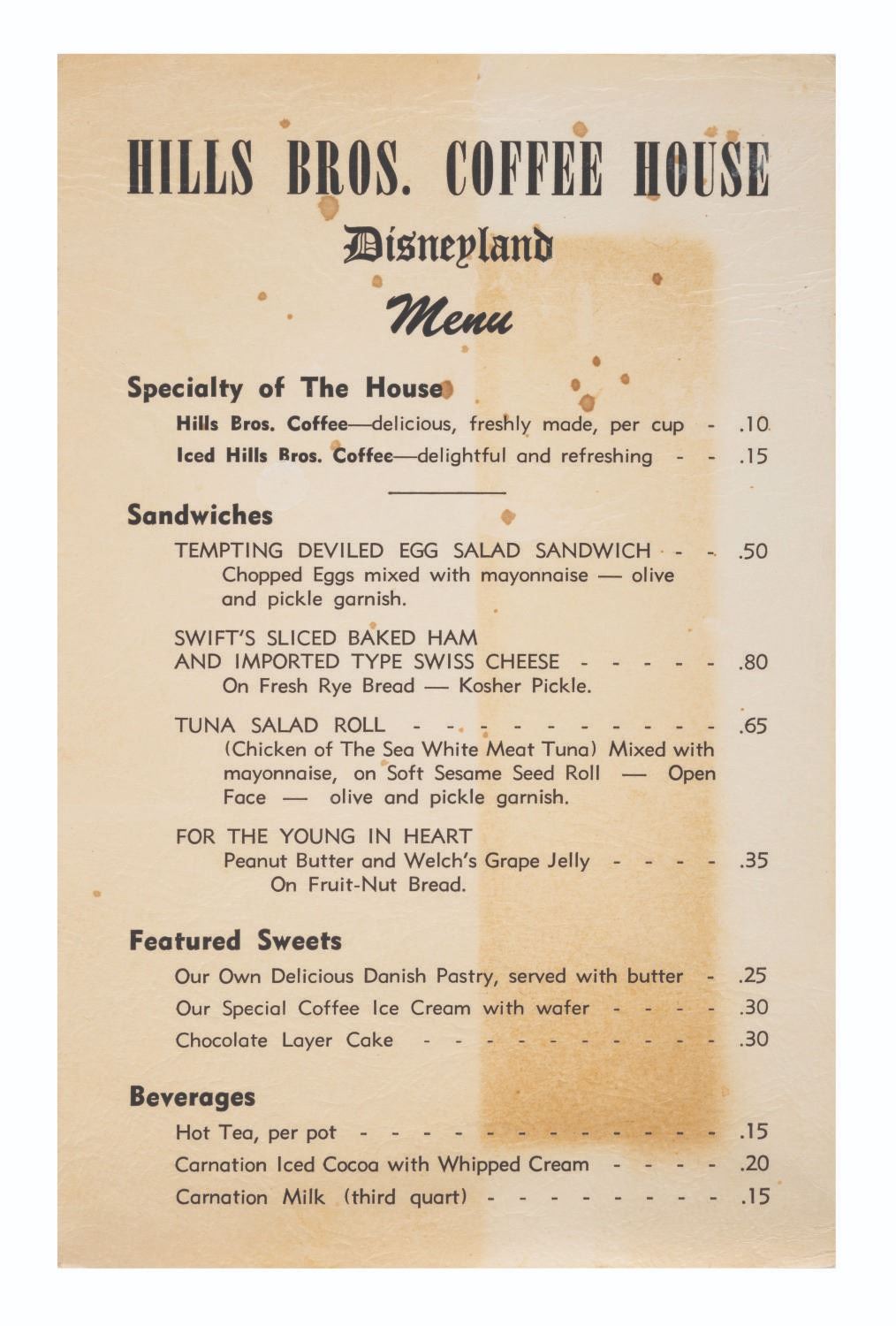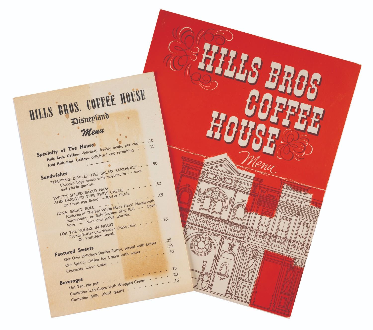 (Disneyland, 1958) A pair of original Hills Bros. Coffee House menus. This pair of menus were in use when Hills Bros. opened during June of 1958. The glossy table menu lists food options available and includes a map of Disneyland, with images of the Columbia and Viewliner Train of Tomorrow. The smaller lunch menu features sandwiches and was utilized later in the day. Measuring 8"x10", the glossy lithographic menu is in good condition with a horizontal crease and wear. Measuring 5.5"x8.5", the cardstock menu is in good condition with brown spots of discoloration and wear.